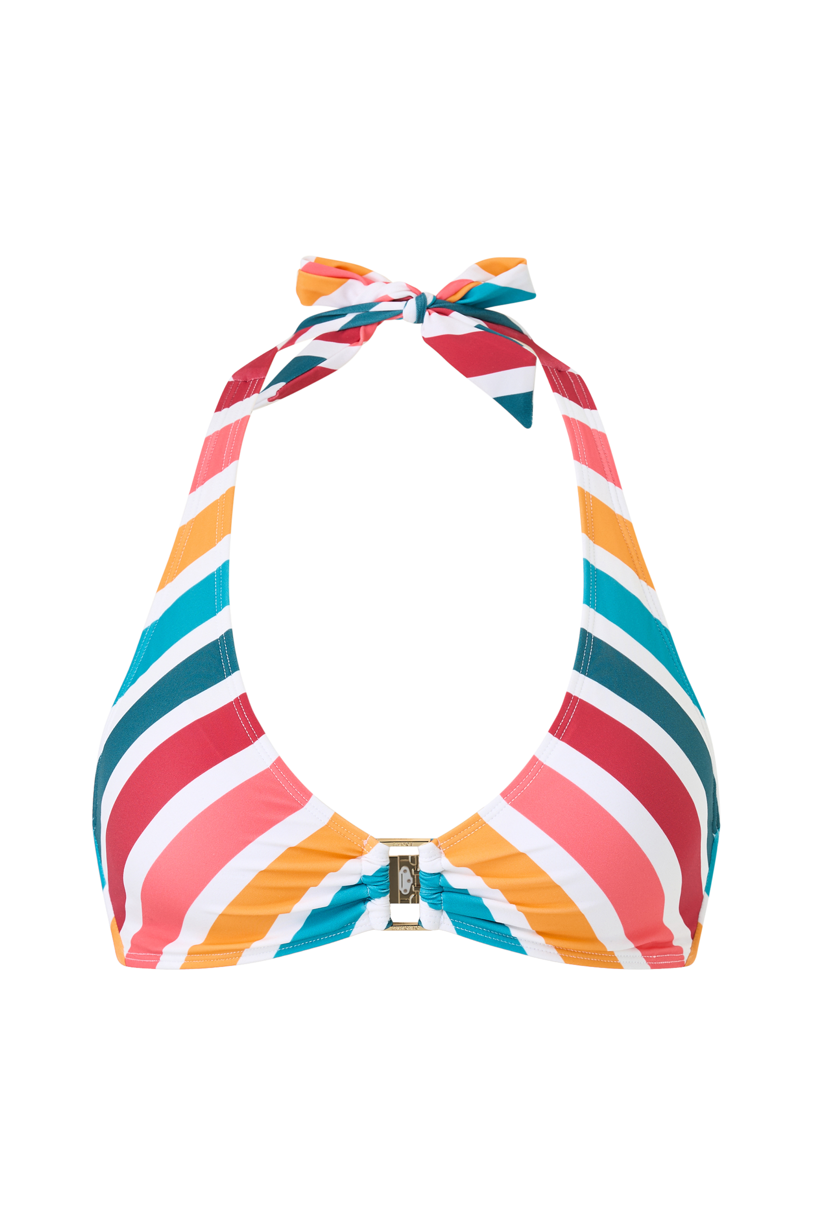 • Bikini-bh med guldfarvet detalje mellem skålene• Aftagelig polstring i kopperne• Spænde i ryggen• Bindbart bånd i nakken• Kan bindes som normale skulderstropper
