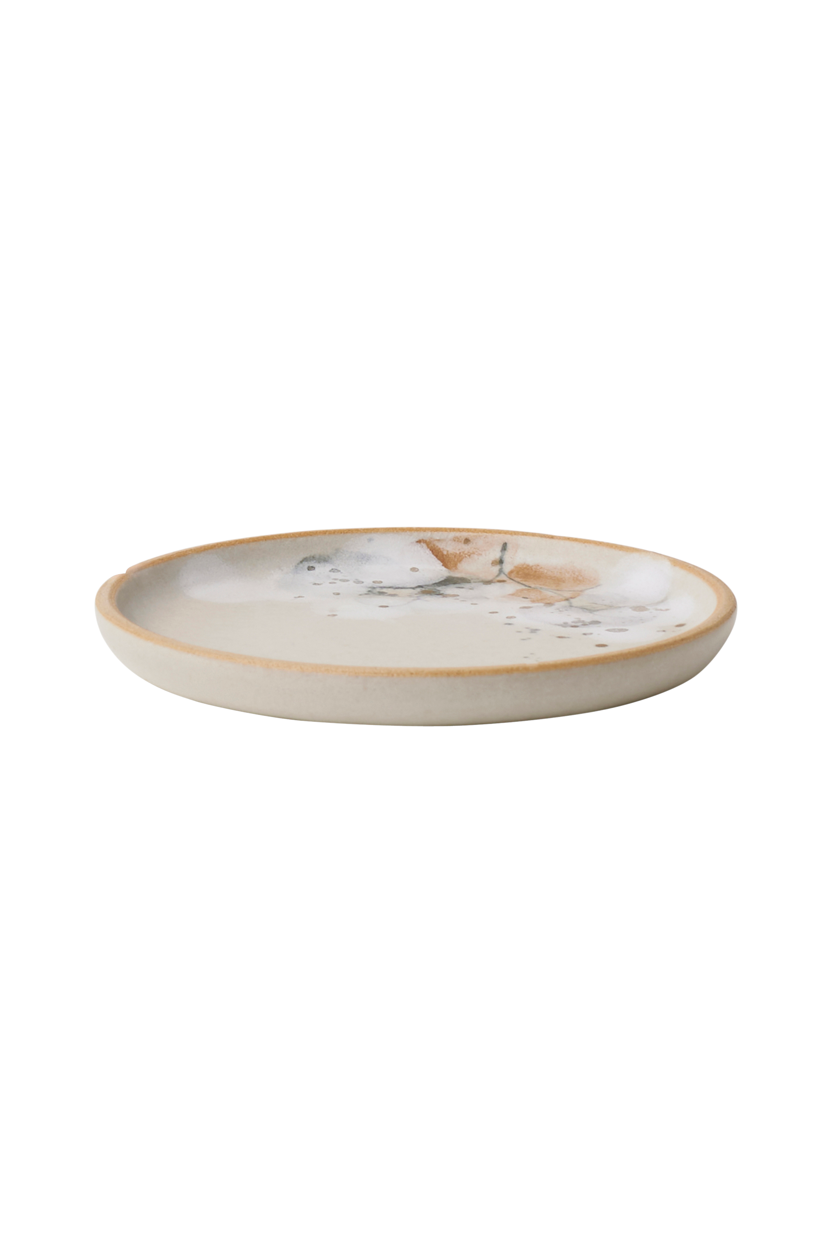 Lille tallerken der også passer som låg til koppen i samme serie, hvor alle dele er drejet og malet i hånden. Alt er lavet af stentøj og designet og fremstillet på Öland. Den har en hvid bund med en håndmalet dekoration af engblomster i varme og grå nuancer. Blomstret abstrakt. Friske, fine penselstrøg med lidt farvestænk.