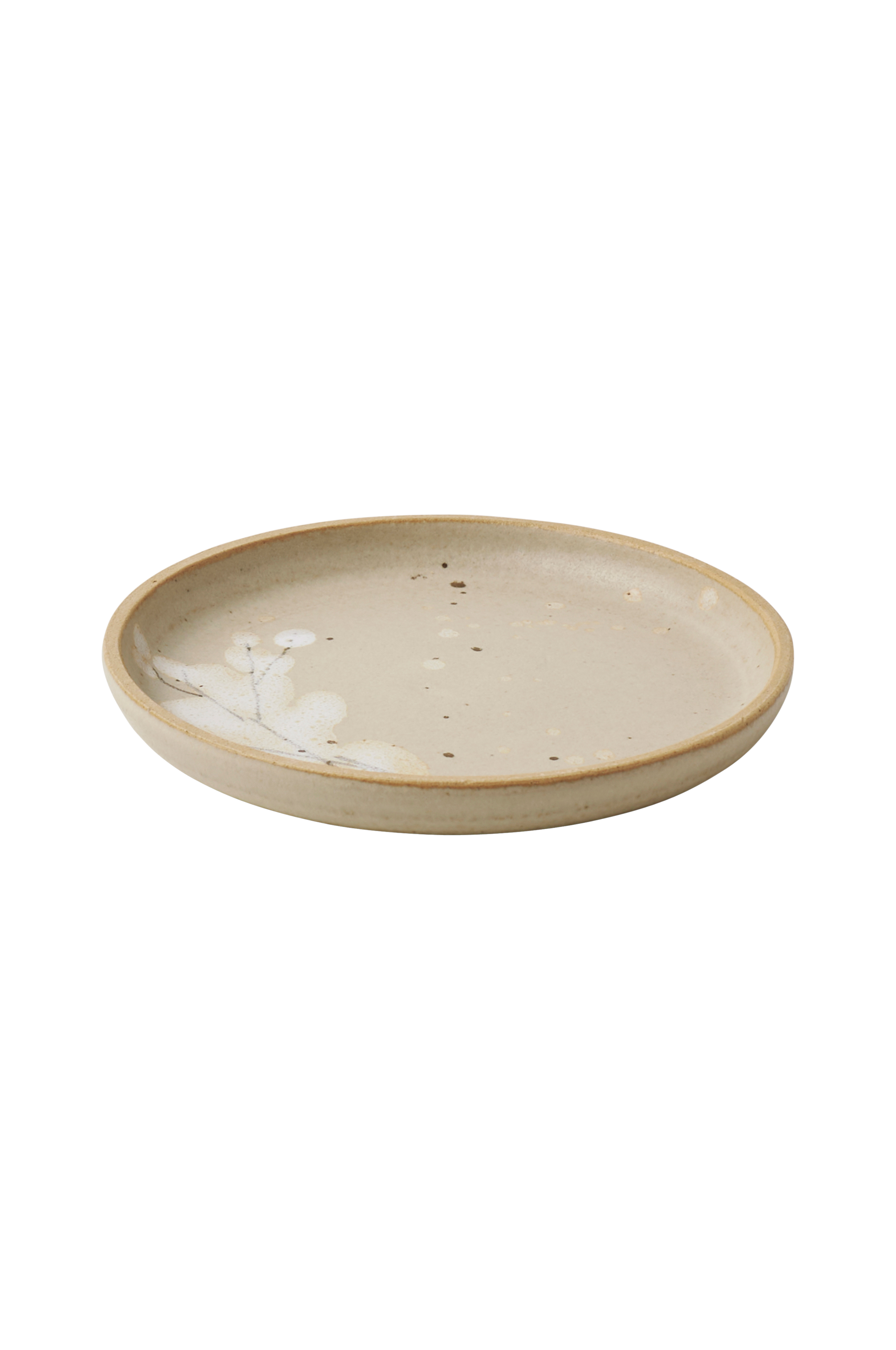 Lille tallerken der også passer som låg til koppen i samme serie, hvor alle dele er drejet og malet i hånden. Alt er lavet af stentøj og designet og fremstillet på Öland. Den har en hvid bund med en håndmalet dekoration af engblomster i varme og grå nuancer. Blomstret abstrakt. Friske, fine penselstrøg med lidt farvestænk.