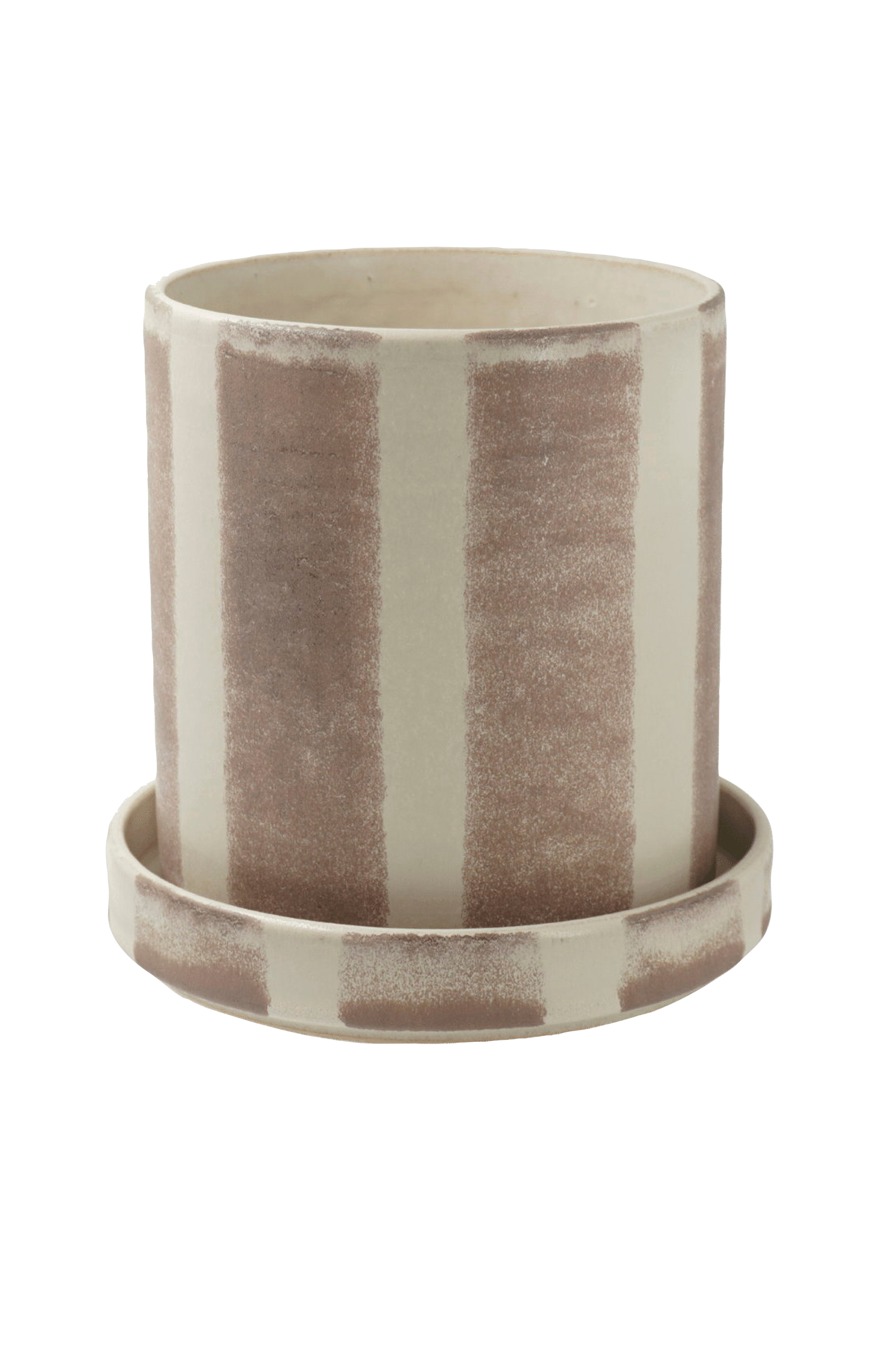 Krukke med brede striber og underskål. Kan bruges både inde og ude. Vi anbefaler dog at keramik tages indenfor i vintermånederne.