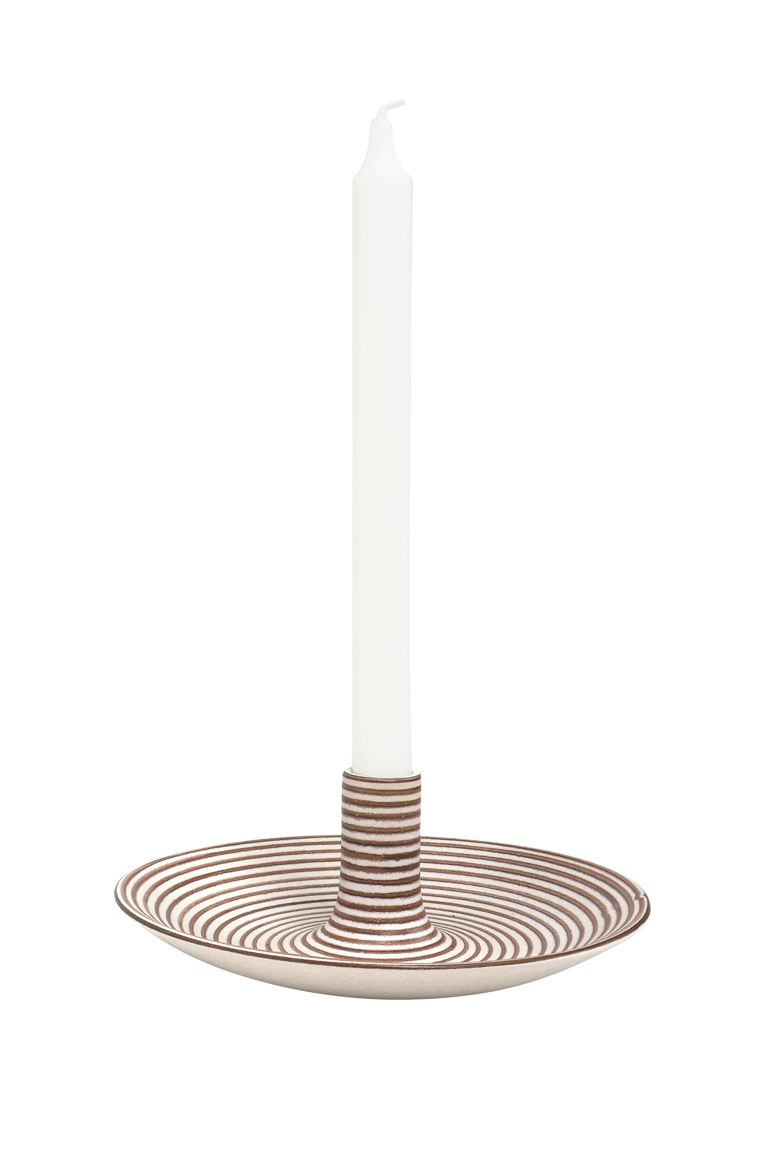 Flot hånddrejet lysestage med håndmalede linjer. Ser flot ud på spisebordet, sofabordet eller vindueskarmen. På tallerkenen kan du lægge pynteting efter årstiden såsom nødder eller slik.