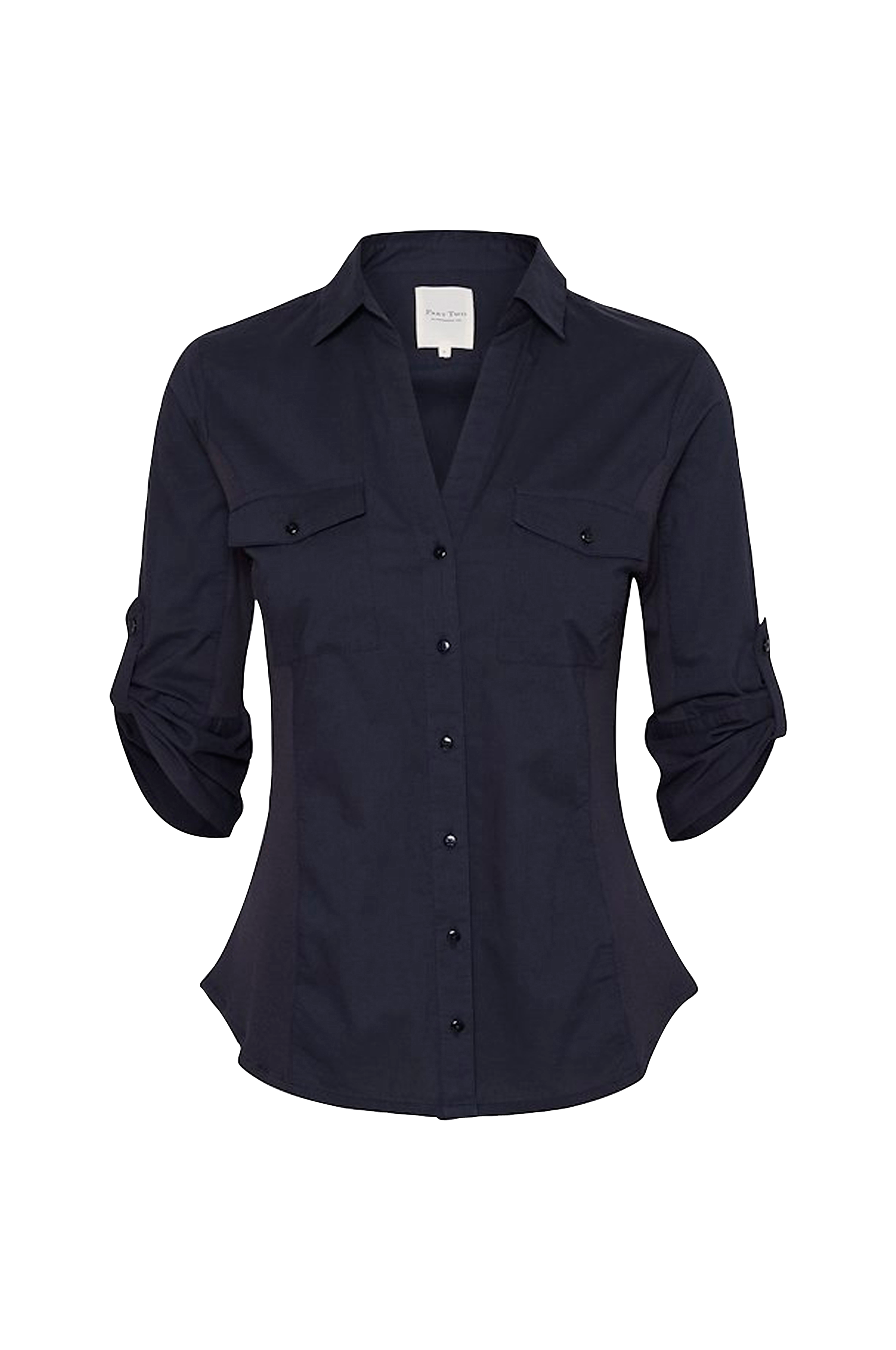 Let figursyet model i vævet kvalitet med indsats af ribstrikket jersey i siden samt på undersiden af ærmet. Lille krave og V-udskæring foran som går over i stolpelukning. Halvlangt ærme med indvendig tamp til opslag samt afrundet kant forneden.