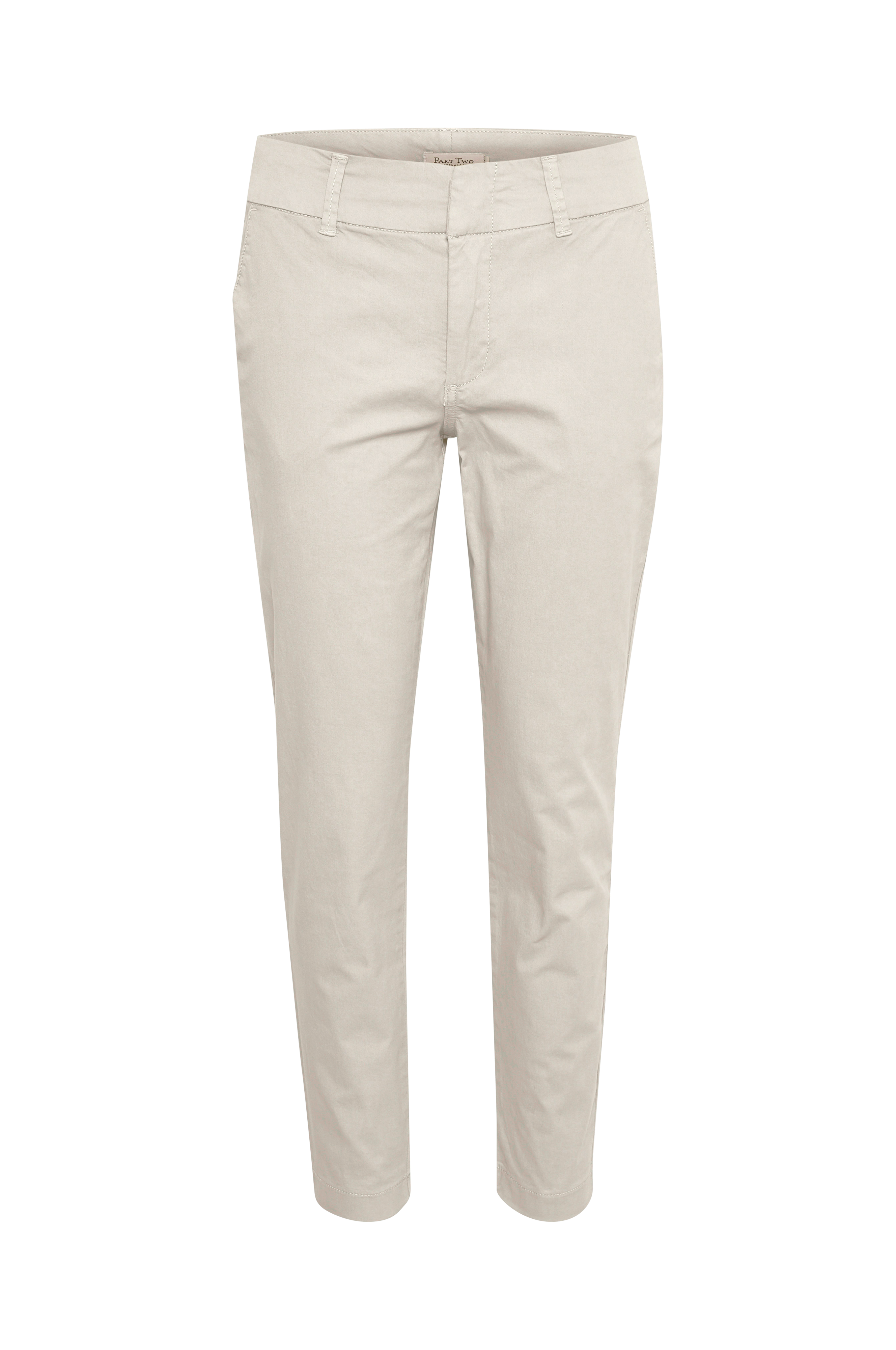 Model med vidde i lårene og bukseben, der bliver smallere nedefter. Bred linning med stropper og skjulte hægter foran samt to skråtskårne forlommer og to indsatte snydelommer bagpå. Indvendig benlængde ca. 72 cm i str. S.