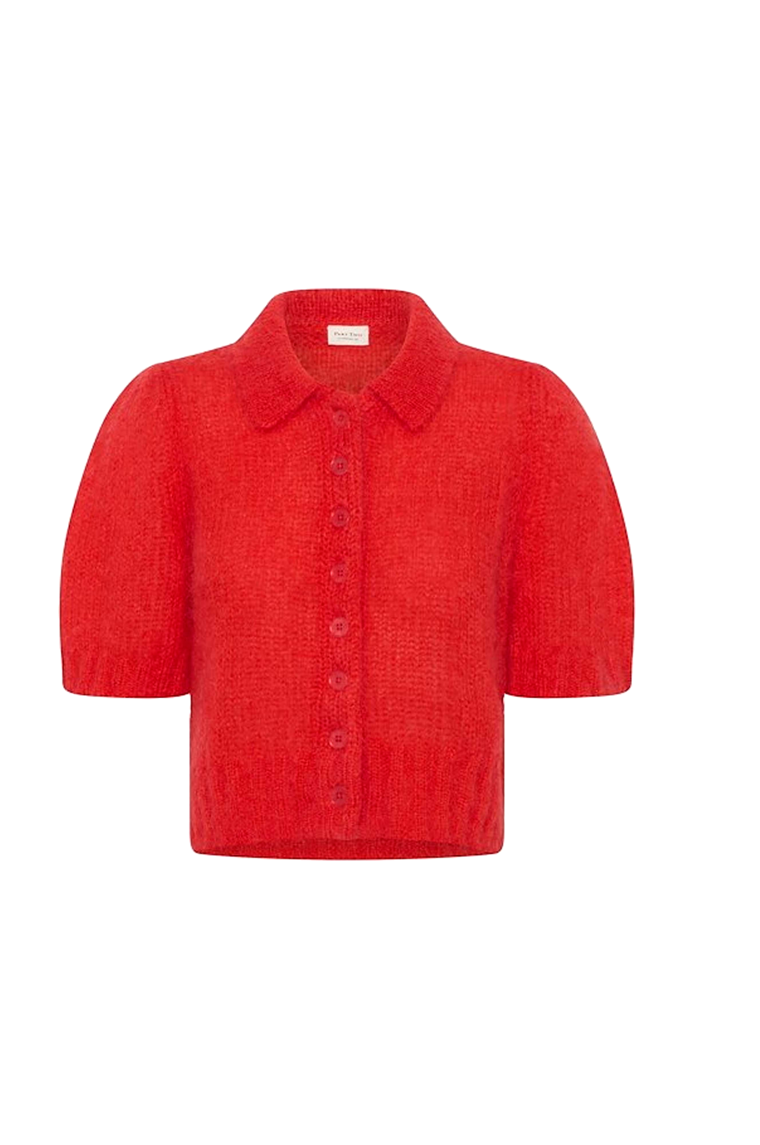 • Cardigan i mohairmiks• Krave• Knapper foran• Korte ærmer