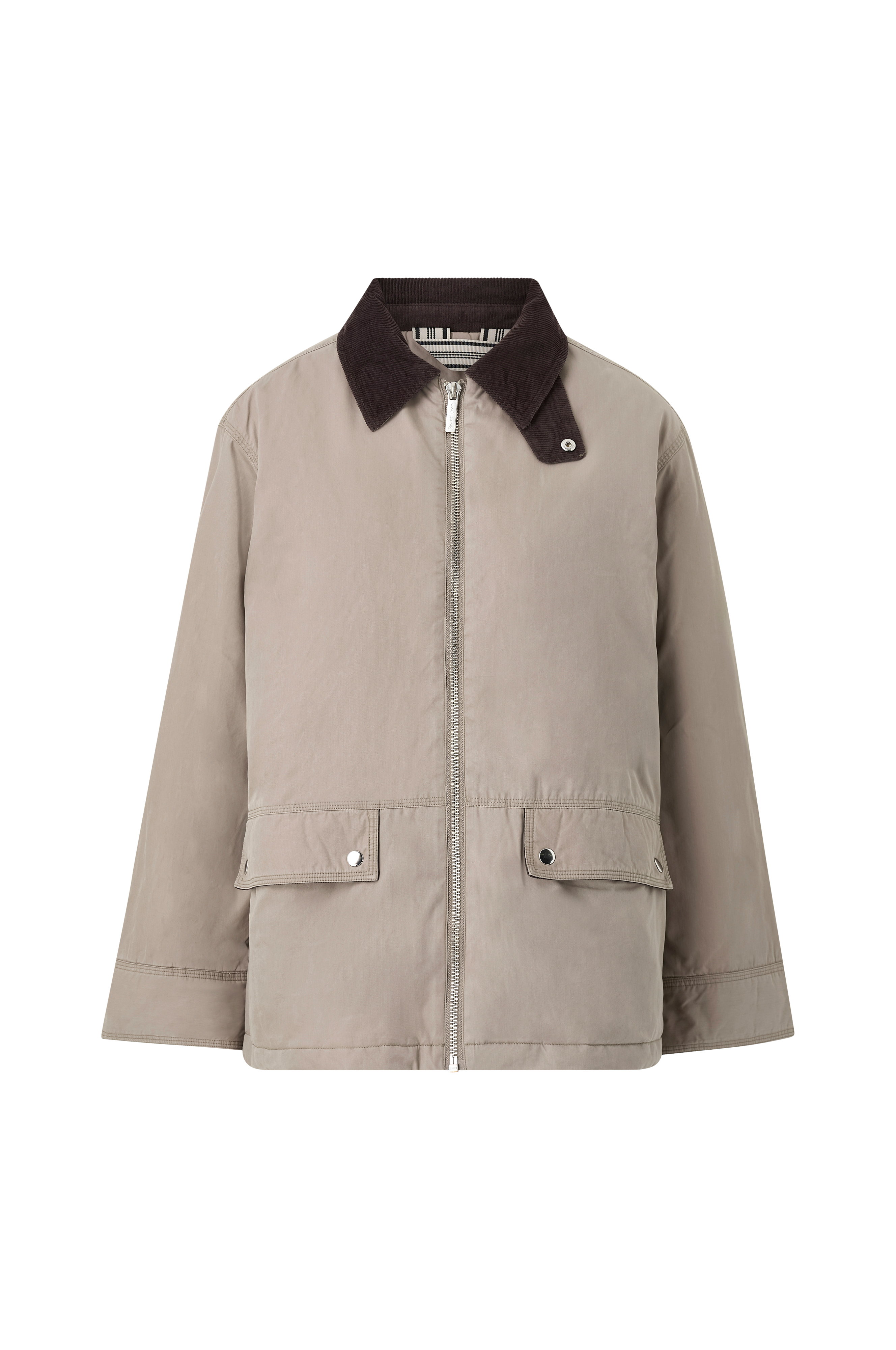 • Let foret jakke• Krave i kraftig fløjl• Trykknapper ved ærmeafslutningerne• Lynlåslukning• Quiltet tekstilforing• En åben inderlomme• To forlommer med låg• Løs pasform• Længde: 71 cm i størrelse 36