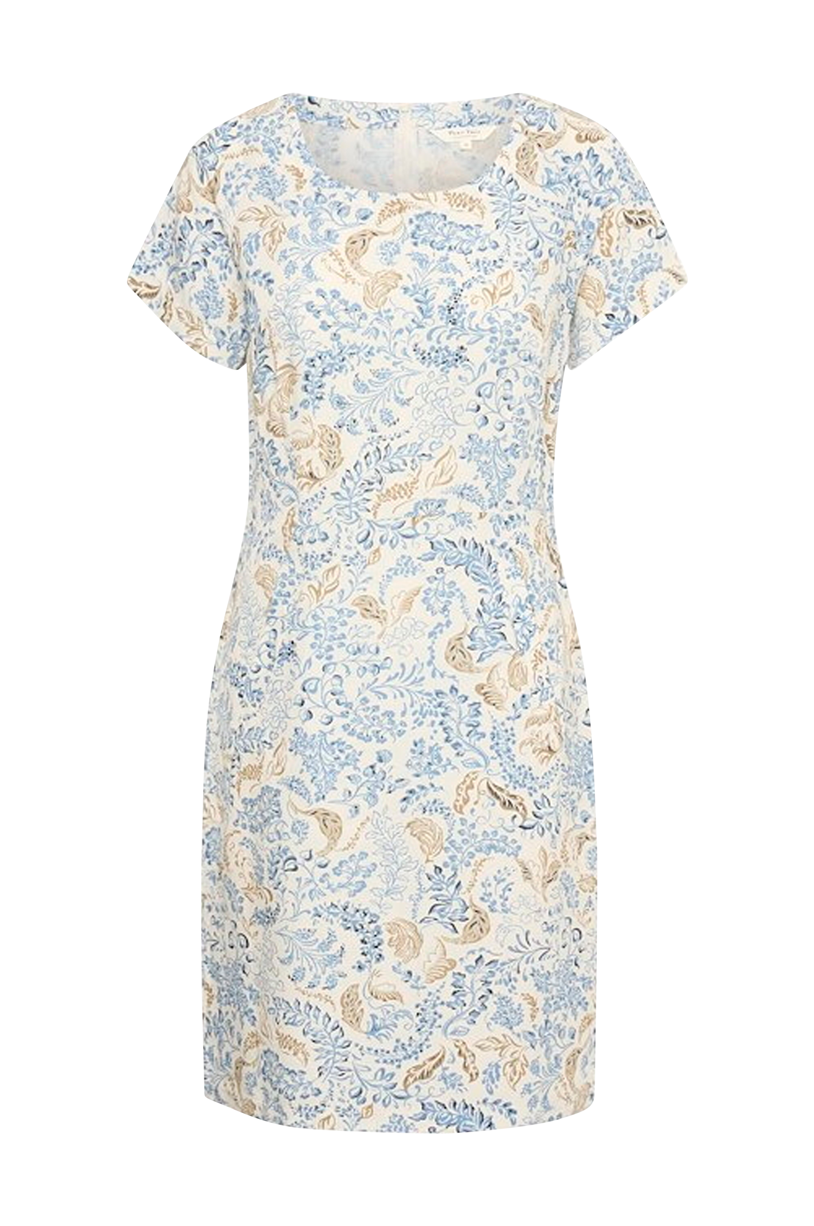 Let figursyet kjole med delesømme foran som har to indsatte lommer. Rund hals med bred søm og skjult lynlås i ryggen samt kort, raglanskåret ærme. Længde ca. 98 cm i str. 36.
