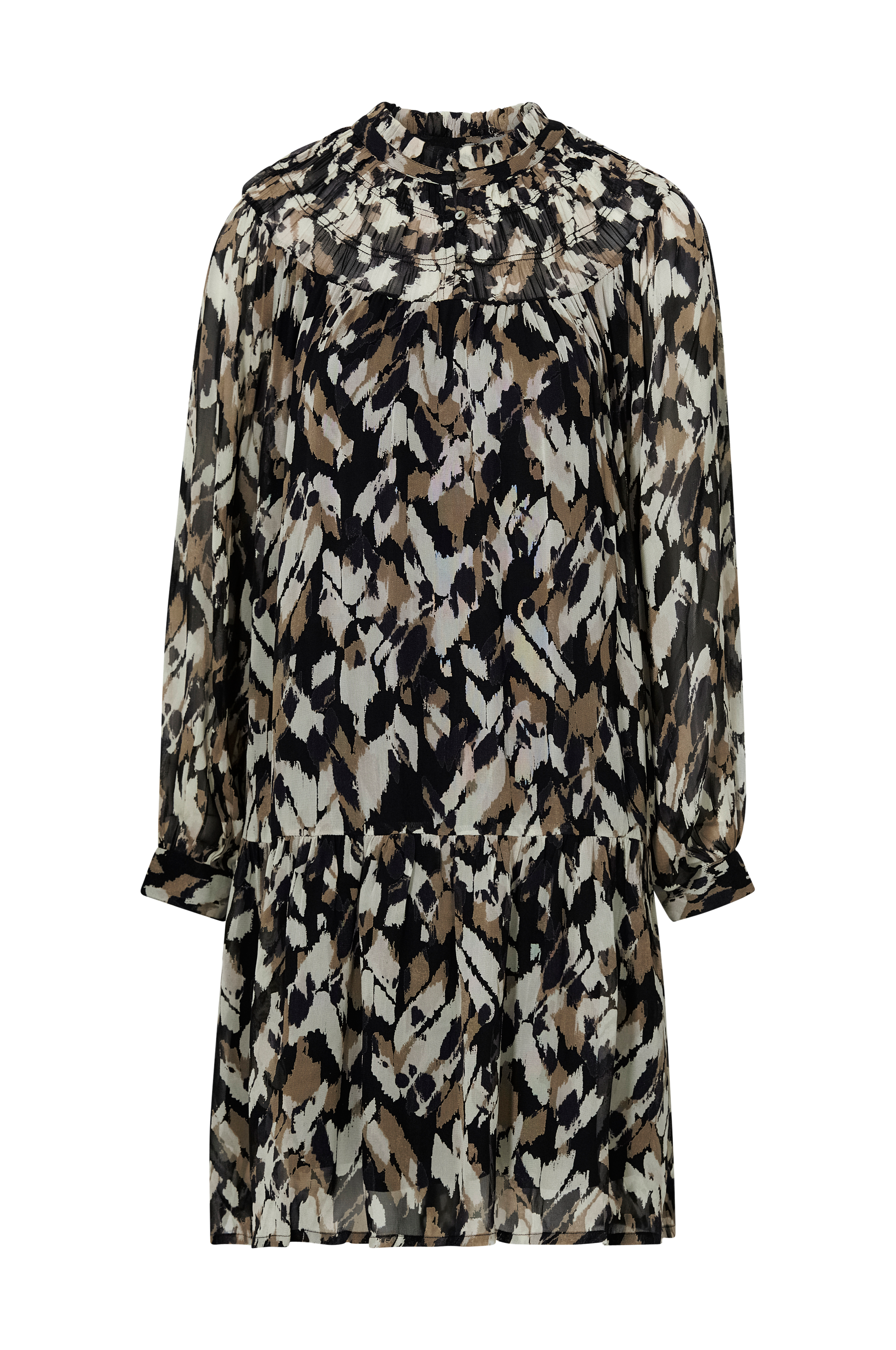 • Lige, bred model i chiffon• Linning med elastiske sømme• Rund hals med lille volant• Langt, bredt ærme med manchet• Bred volant ved nederste kant• Foret• Længde: 97 cm i størrelse 36