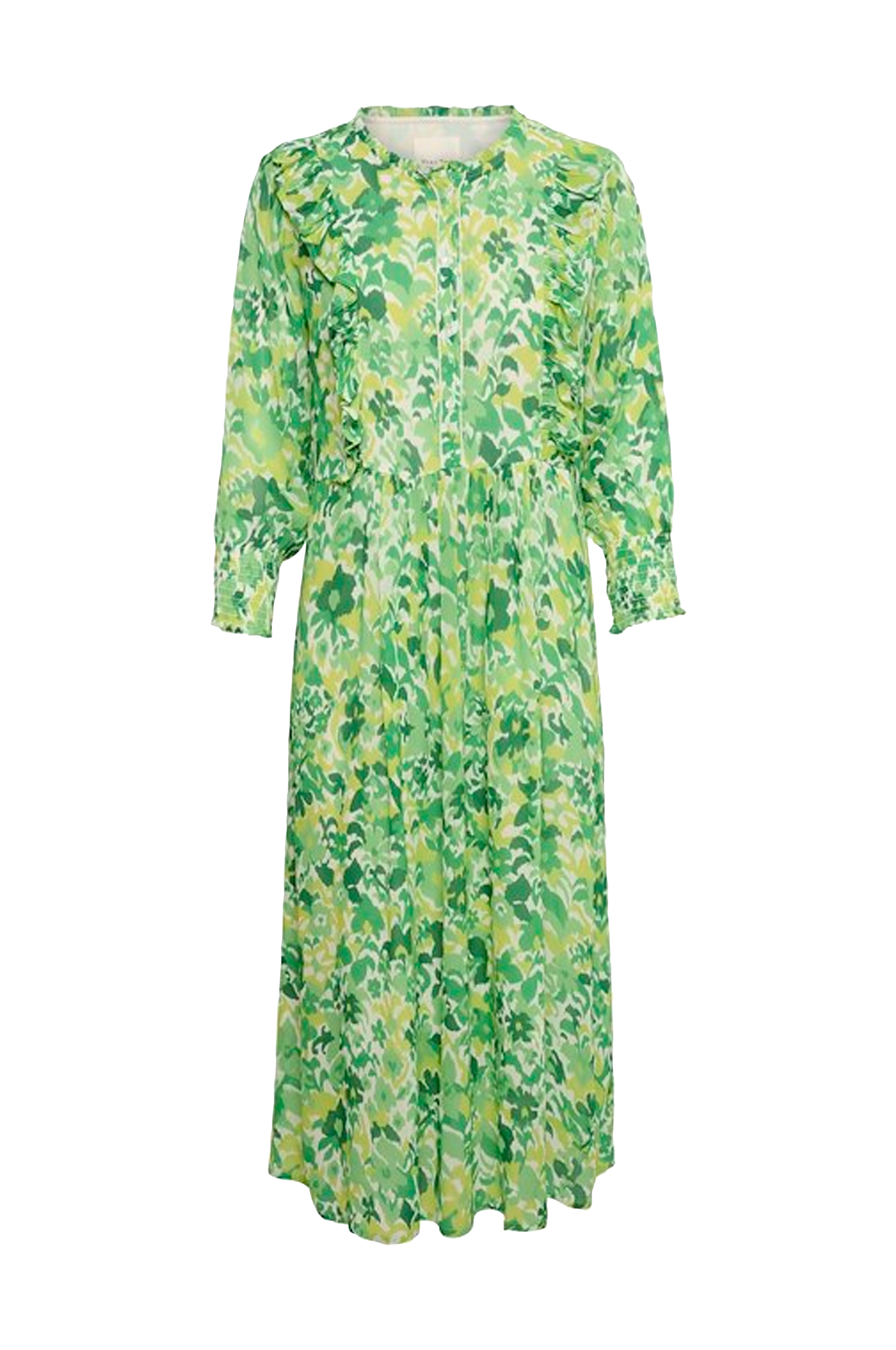 • Læglængde kjole i chiffon• Knapper oppe foran• Lange ærmer med smock ved manchetterne• Volanter foran• Foret• Længde: 125 cm i størrelse 36