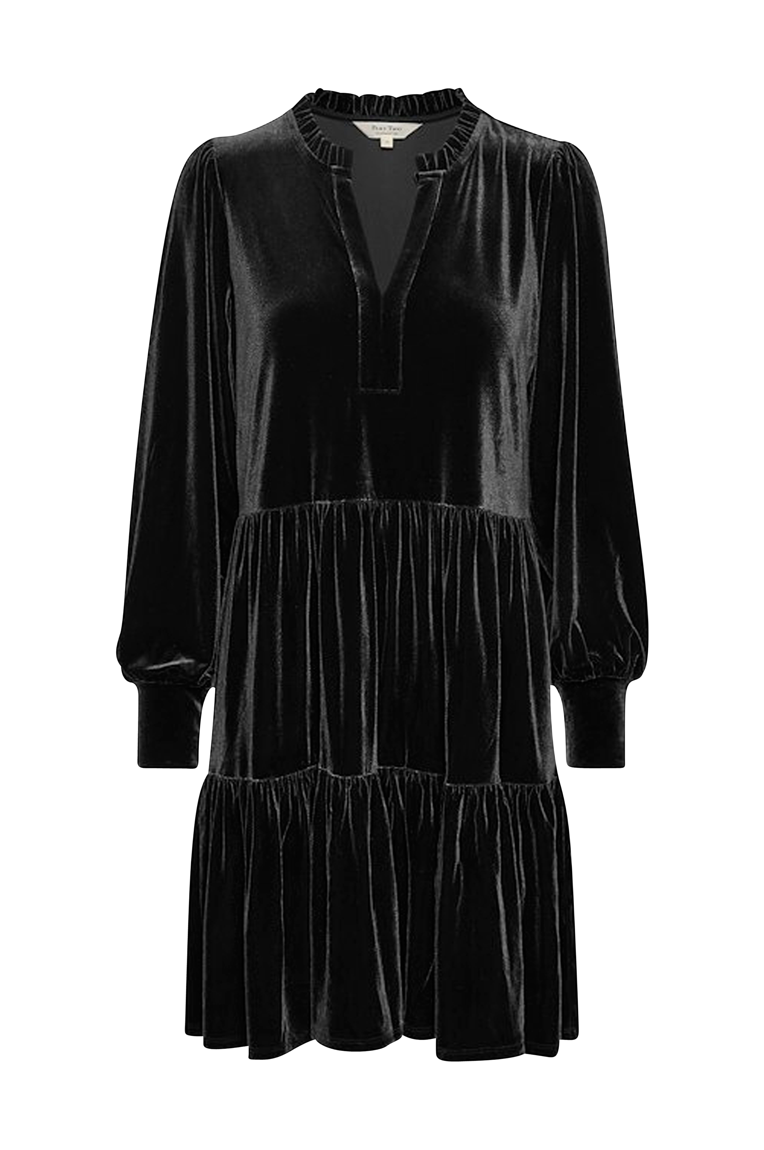 • Bred model med svaj i velour • Rund hals med lille volant • Rynker ved taljen • Langt ærme med manchet ved manchetterne • Volant nederst • Længde: 94 cm i størrelse S