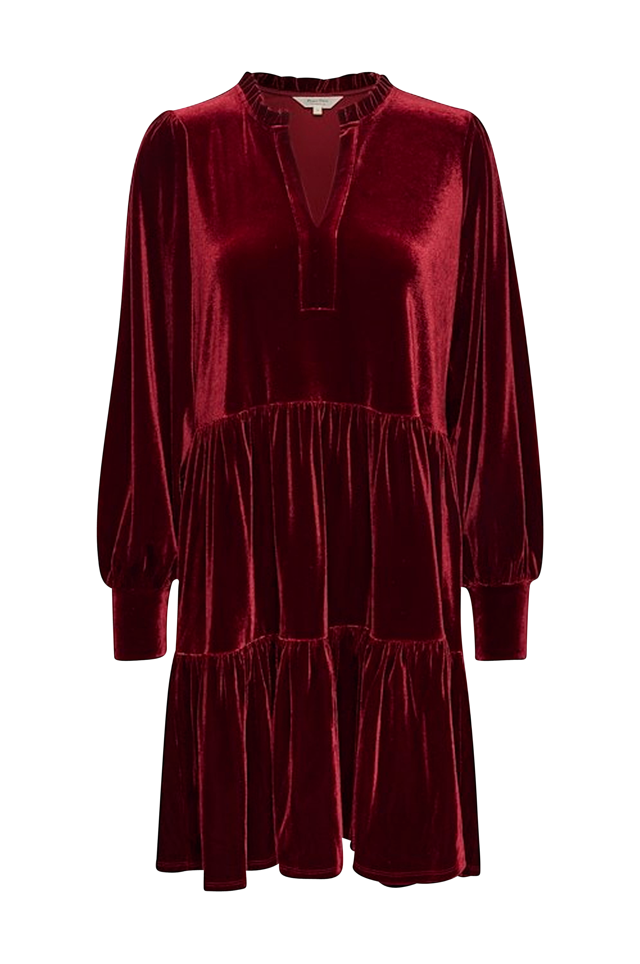 • Bred model med svaj i velour • Rund hals med lille volant • Rynker ved taljen • Langt ærme med manchet ved manchetterne • Volant nederst • Længde: 94 cm i størrelse S