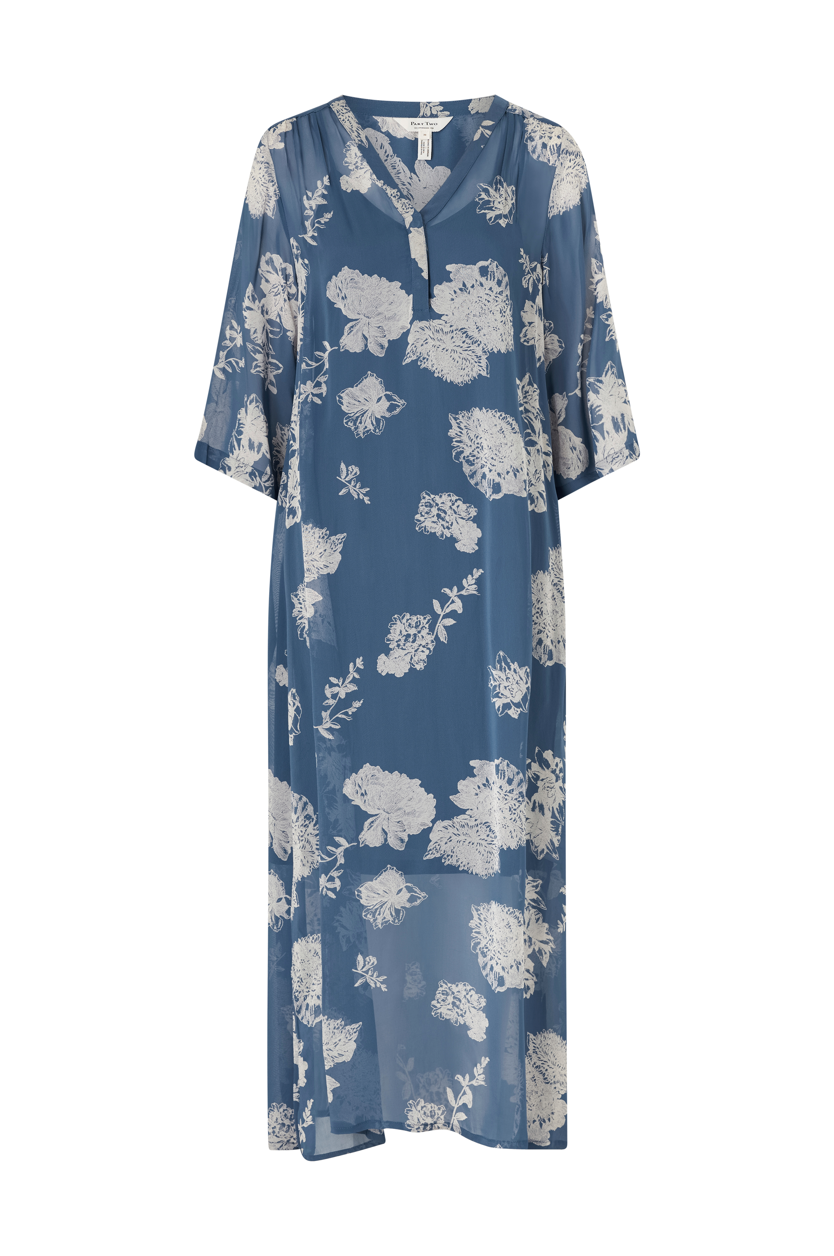 • Lang model i chiffon• V-formet halsudskæring med kort knaplukning foran• Lige, halvlangt ærme• Slidser nede i siderne• Udtagelig underkjole med v-formet halsudskæring og tynde, justérbare skulderstropper• Længde: 131 cm i størrelse 36