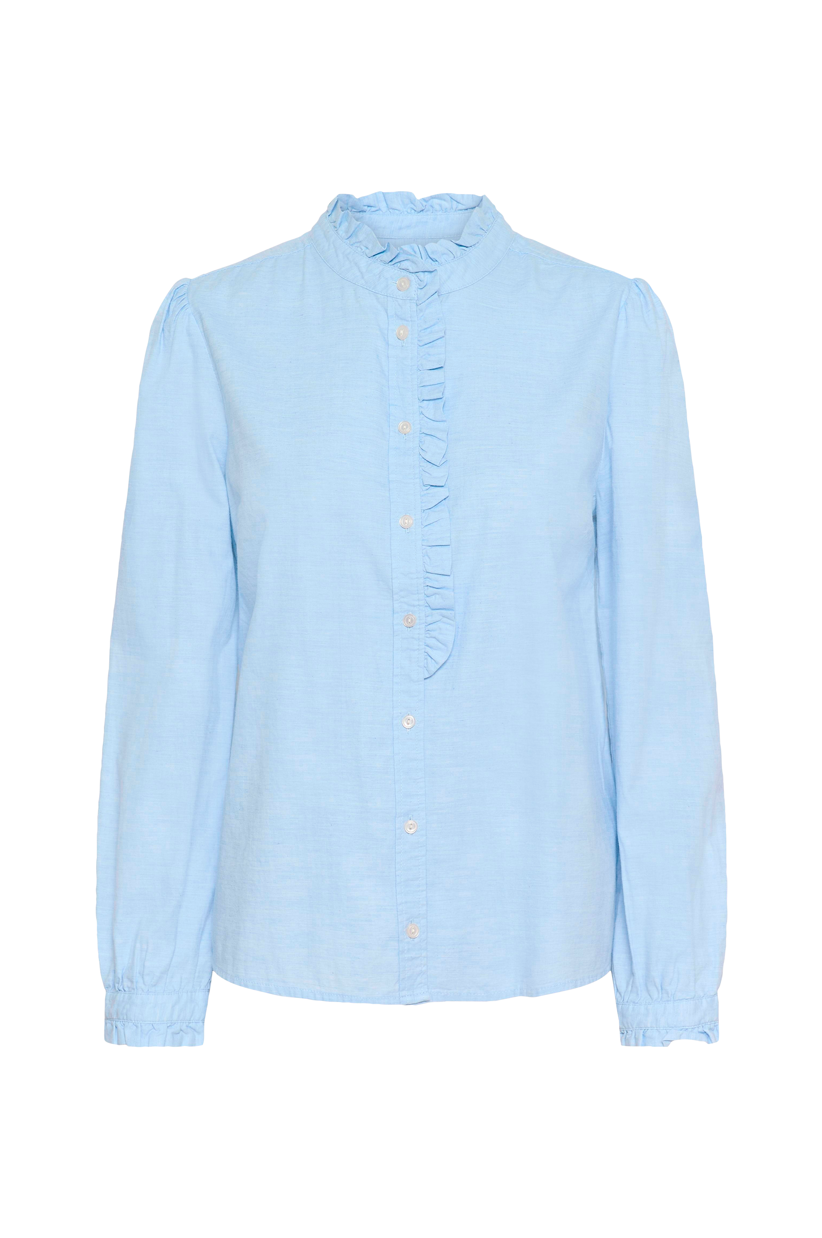 • Skjorte i bomuld• Rund halsudskæring med flæsekrave• Knapper foran• Lange pufærmer med volant på manchetterne• Afrundet søm