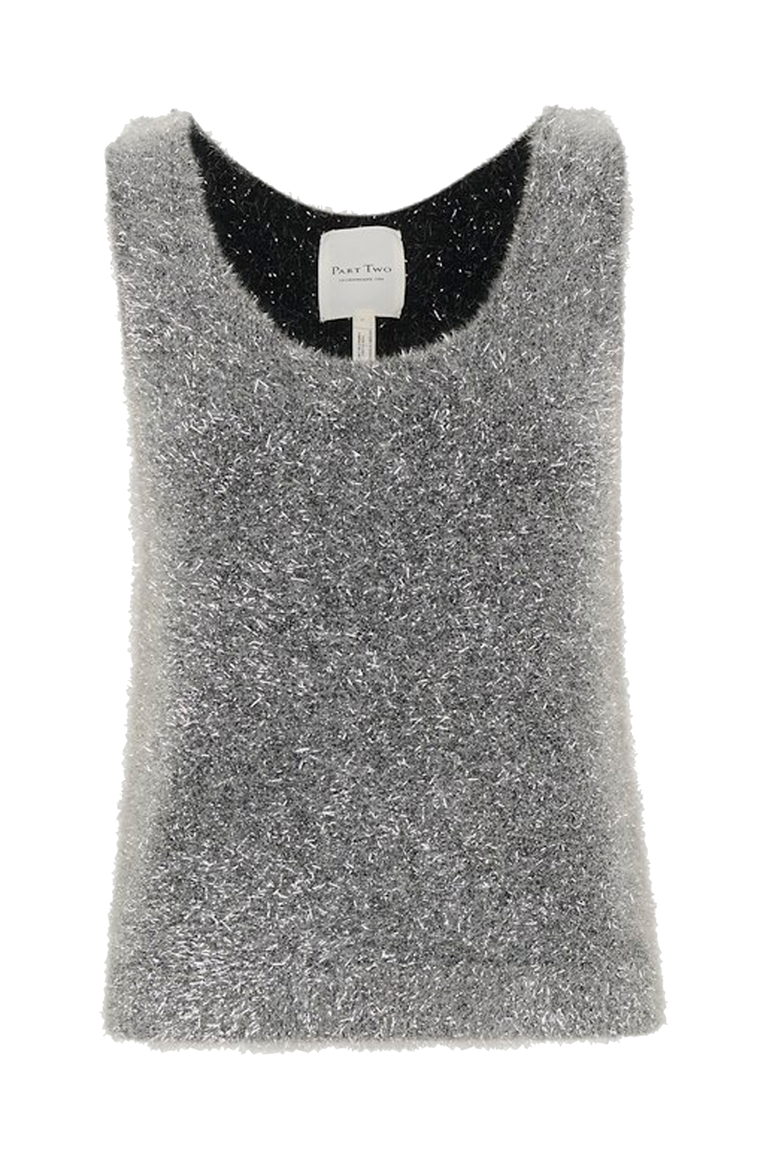 • Ærmeløs, glitrende model• Bred halsudskæring• Smal ribstrik ved nederste kant