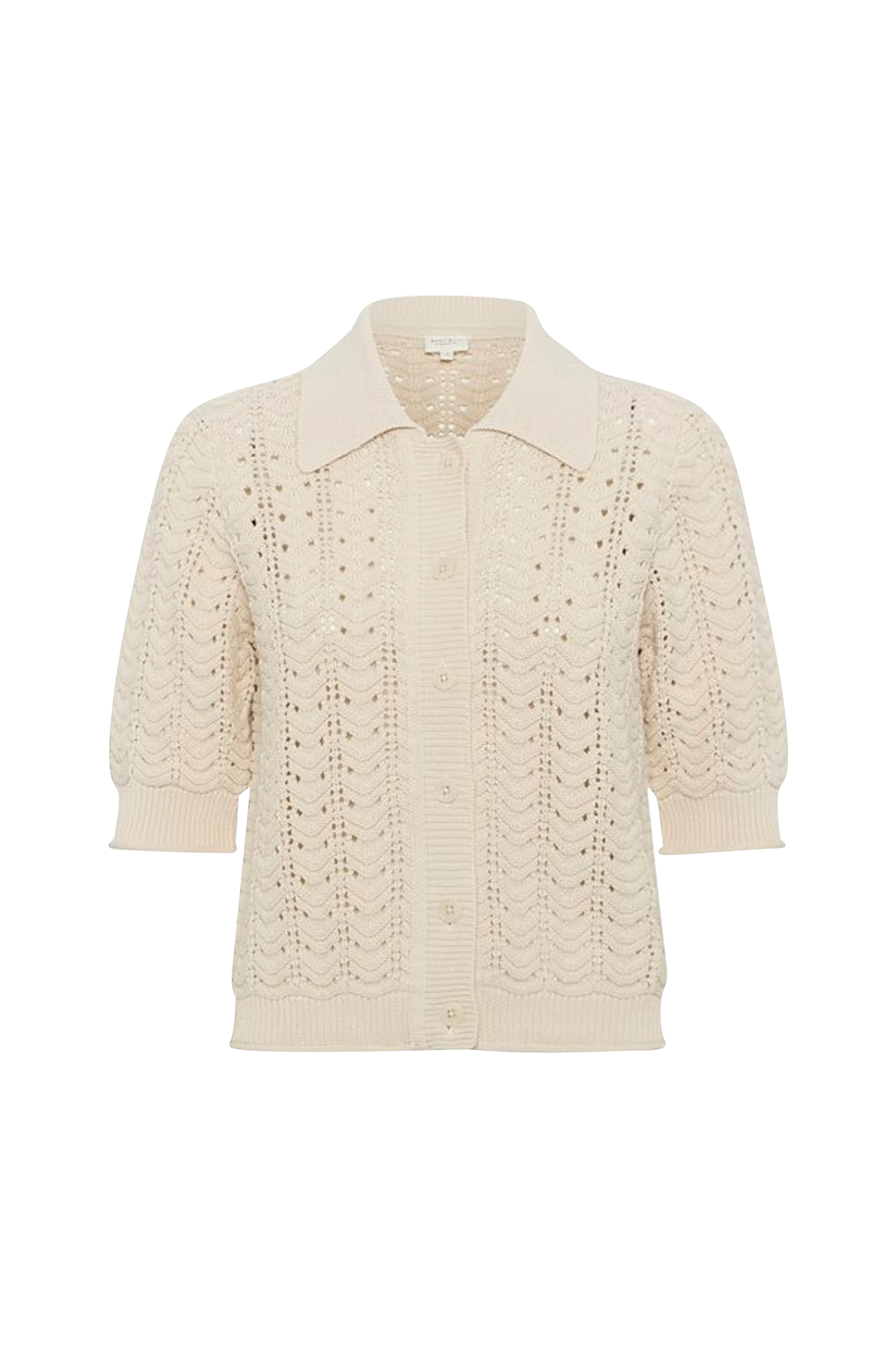 • Mønsterstrikket model• Ribstrikket krave• Knapper foran• Halvlangt ærme• Ribstrik med rullekanter ved ærmeafslutningerne og nederst