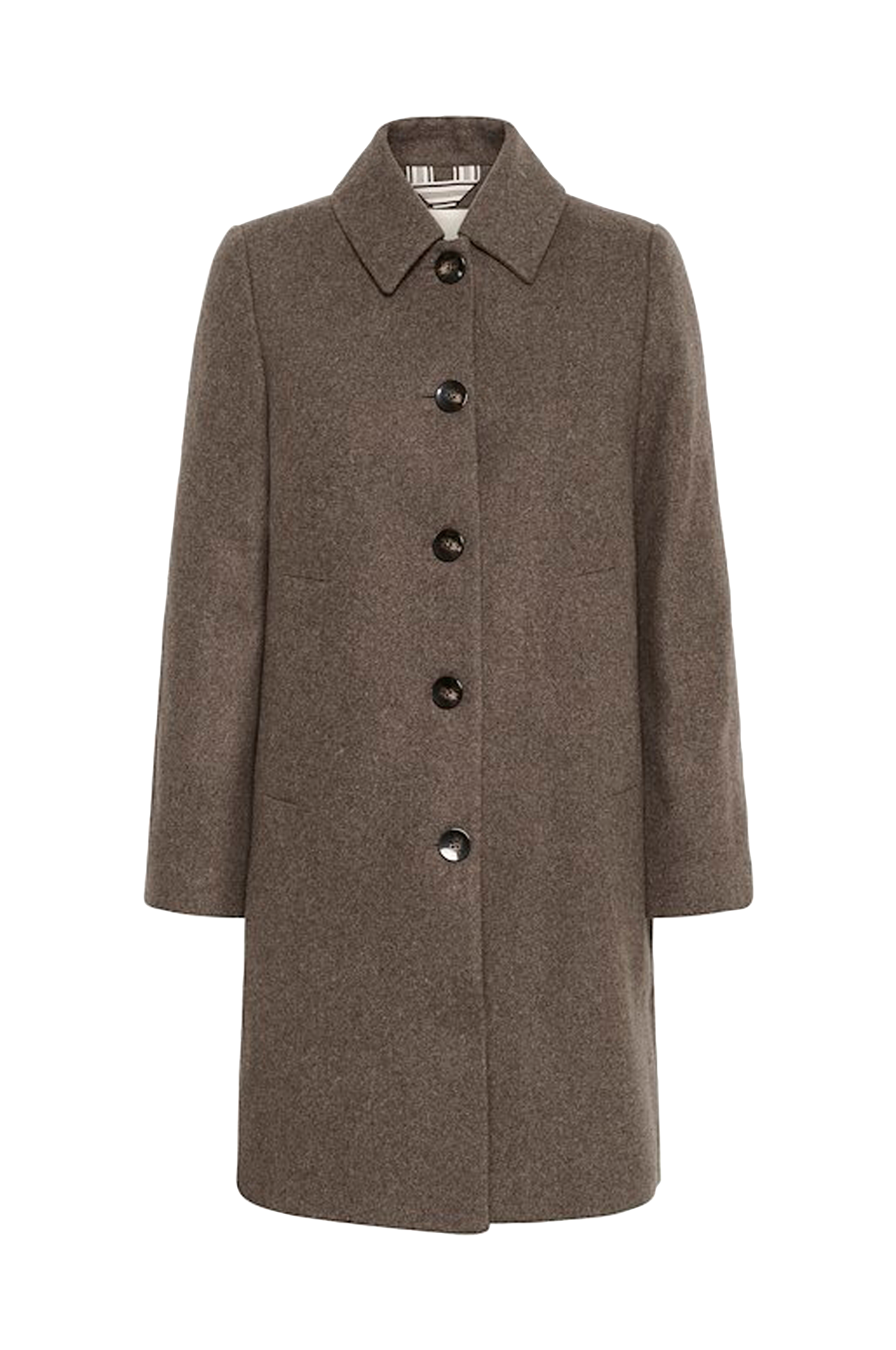 • Frakke i uldblanding• Krave• Knaplukning• Tekstilforing• Sidelommer• Længde: 93 cm i størrelse 36