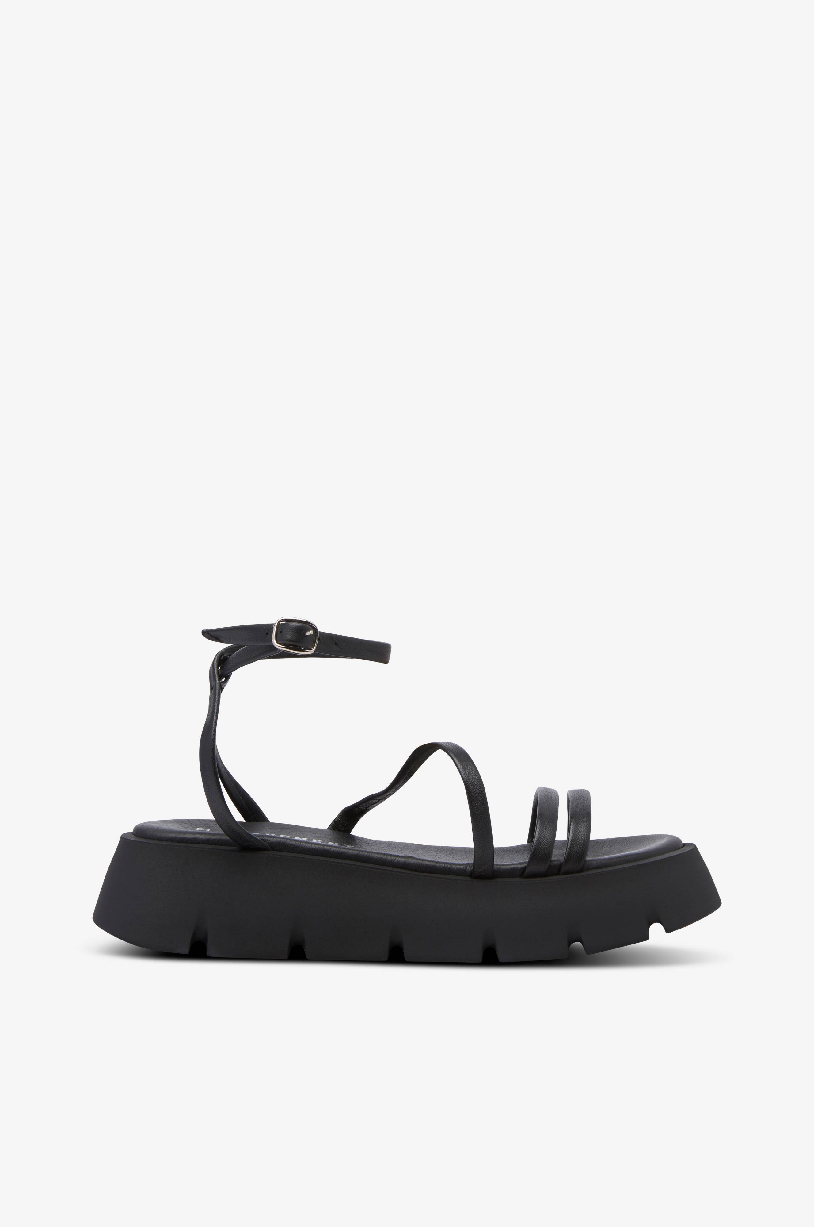 Håndlavede sandaler med groft mønstret plateausål og smalle remme i skind. Ankelrem med justerbart metalspænde. For og indersål i skind. Ydersål i gummi. Sålhøjde ca. 5 cm.