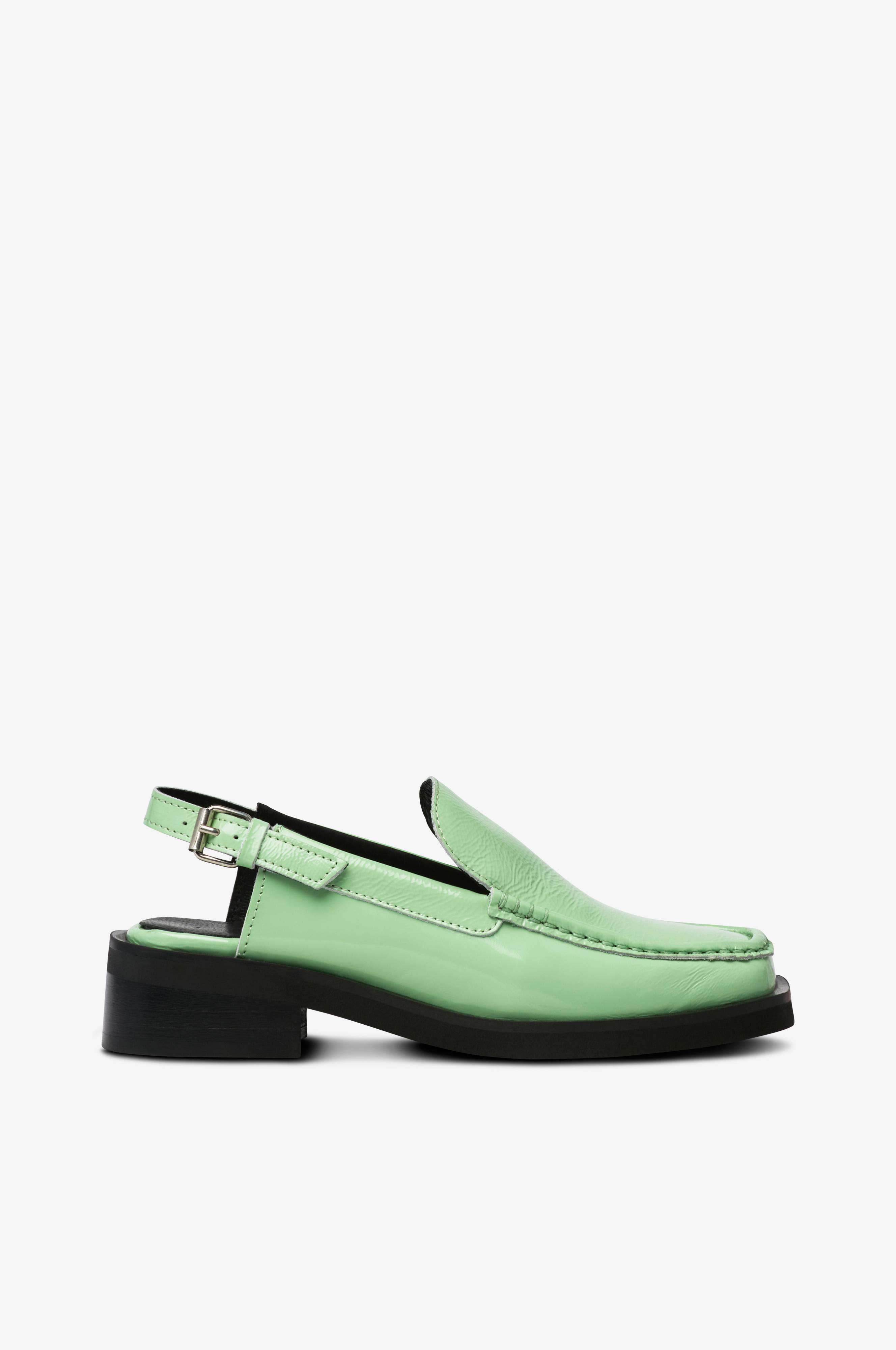 Slingback-loafer i læder med firkantet tå med dekorativ søm rundt om. Åben hæl med justerbar rem med spænde.Hælhøjde ca. 4 cm.