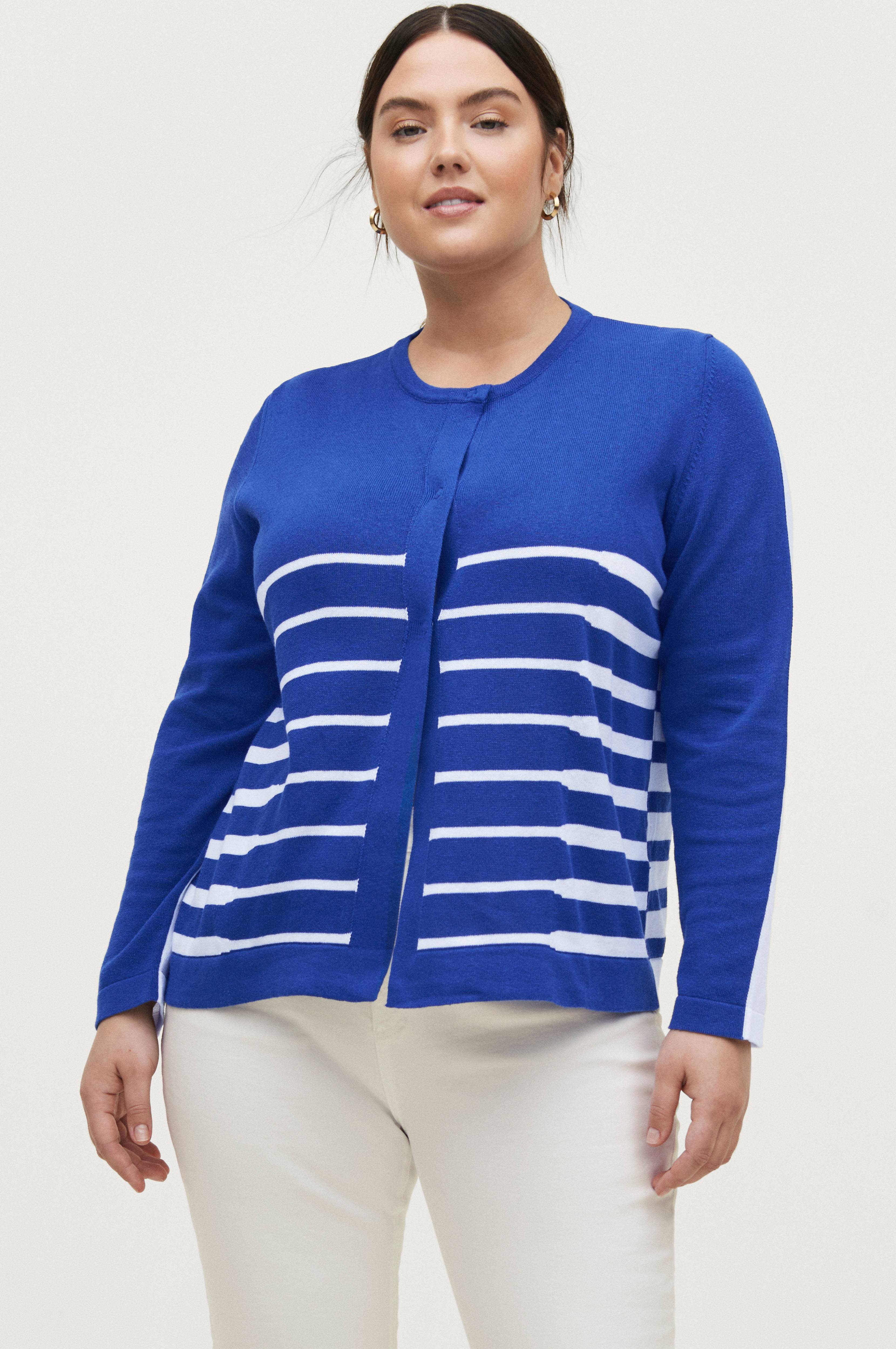 Lige model med finstrikkede striber i matchende farve som er modsatte bagpå. Rund hals med strikket kant og stolpelukning med skjulte trykknapper.