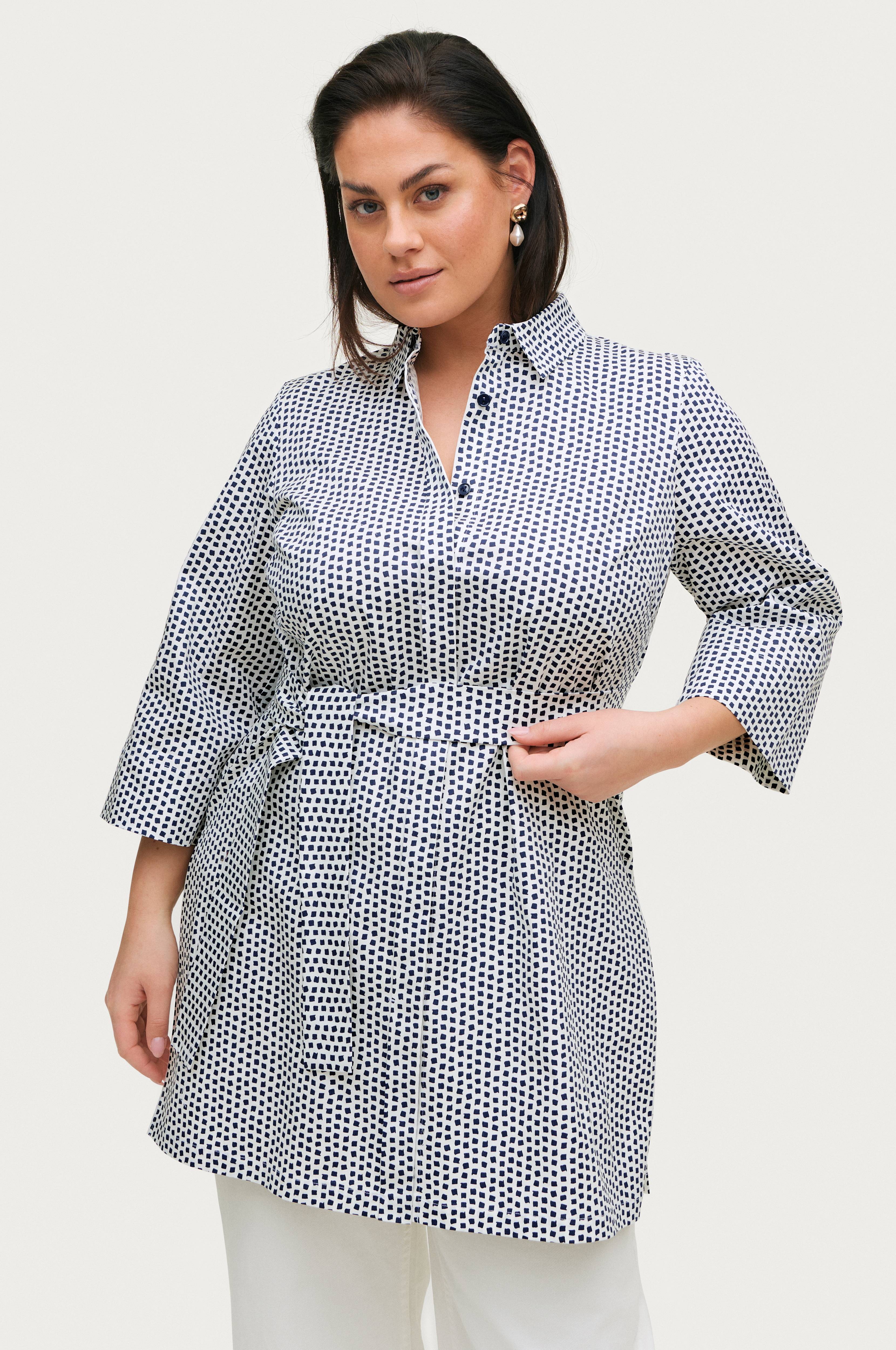• Tynd frakke i bomuldsstof med stræk• Skjulte knapper foran• Høje slidser i siderne• 3/4 lange ærmer• Bindebælte• Uforet• Store størrelser• Længde: 90 cm i størrelse 46