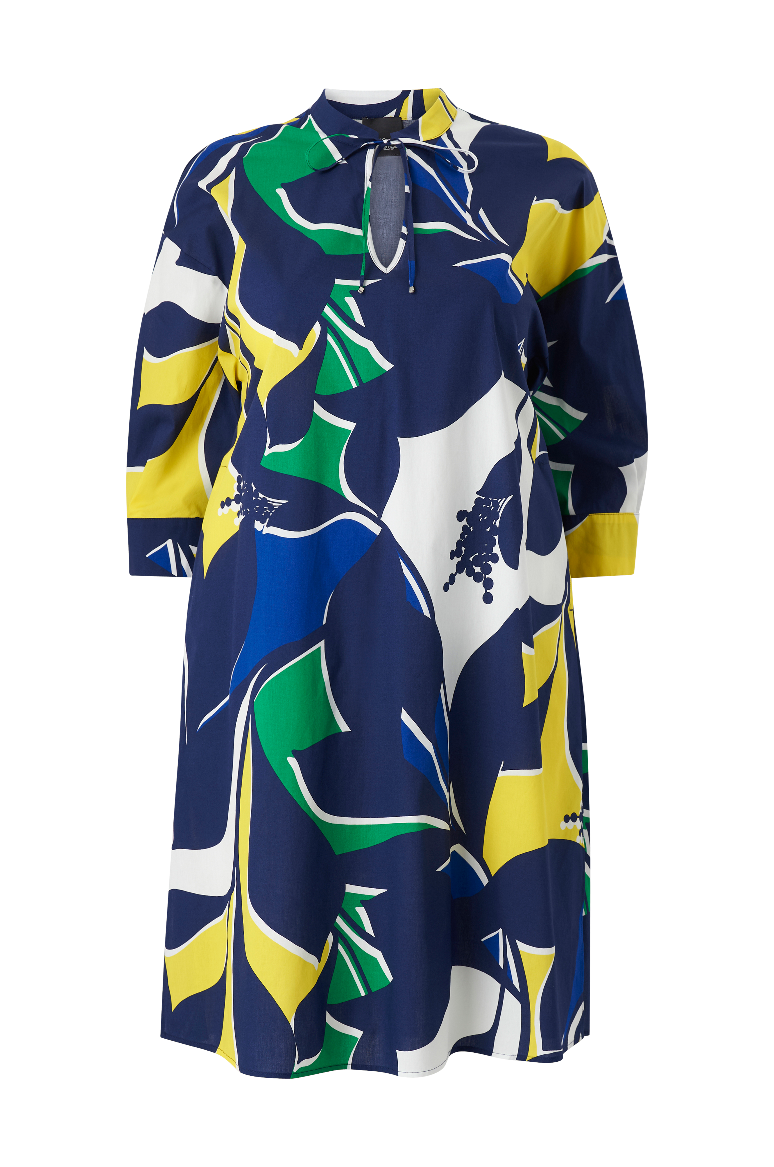 • Mønstret kjole• V-udskæring med bindebånd• 3/4 lange ærmer med bindebånd• Lommer i siderne• Slidser i siderne• Store størrelser• Længde: 105 cm i størrelse 46