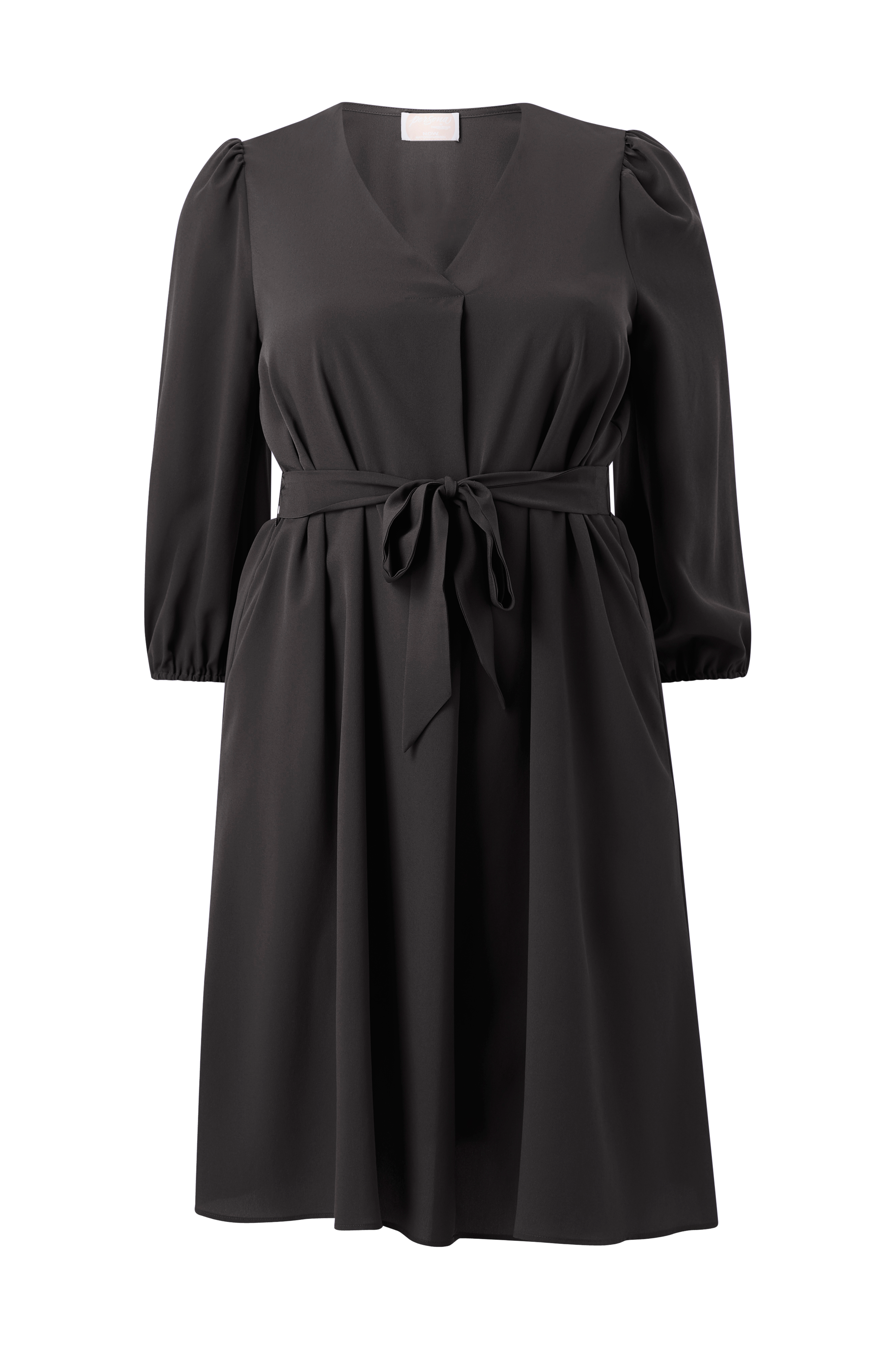 • V-formet halsudskæring• Bølgeformet detalje midt foran• 3/4 lange ballonærmer med elastik ved manchetterne• Aftageligt bindebælte ved taljen• Store størrelser• Længde: 105 cm i størrelse 44