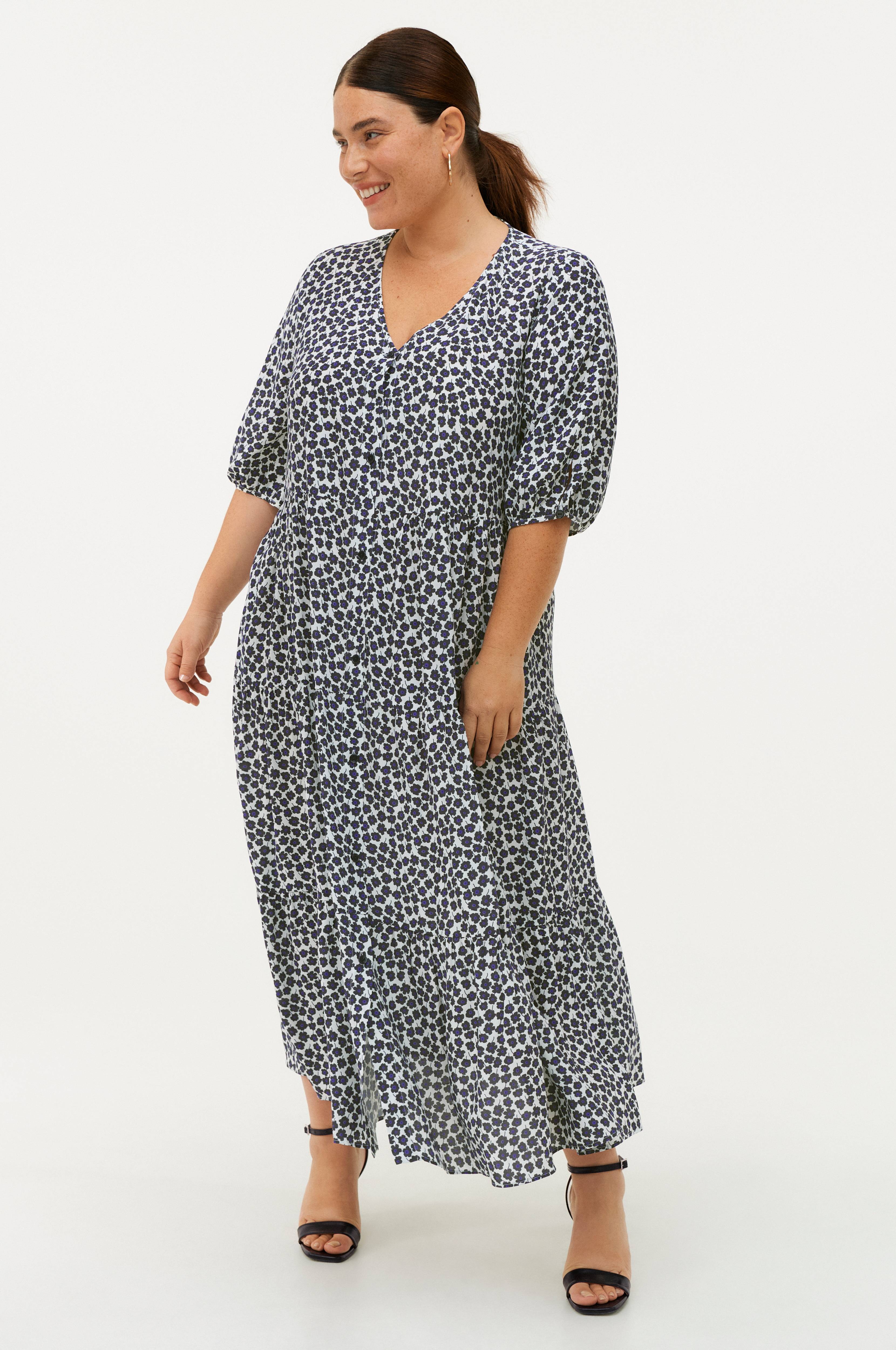 • Model med svaj• V-udskæring• Knap foran• Halvlange ballonærmer• Samlinger på skørtet• Store størrelser• Længde: 135 cm i størrelse 48