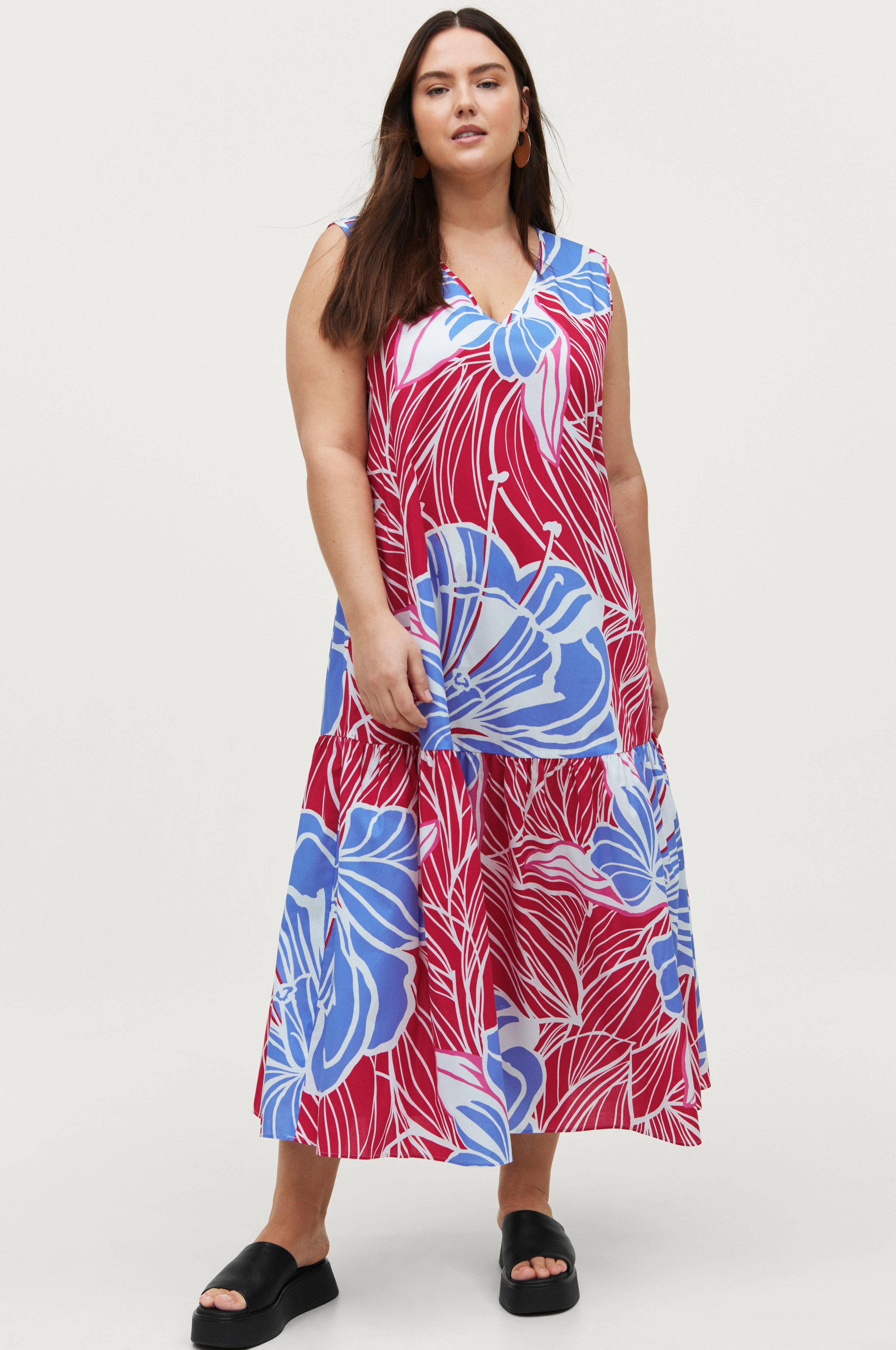 Ærmeløs kjole i A-formet, vid model med bred, rynket indsats i kanten forneden. V-formet halsudskæring med smalt kantbånd. Kort ærme følger med og kan sys på. Længde ca. 135 cm i str. S.