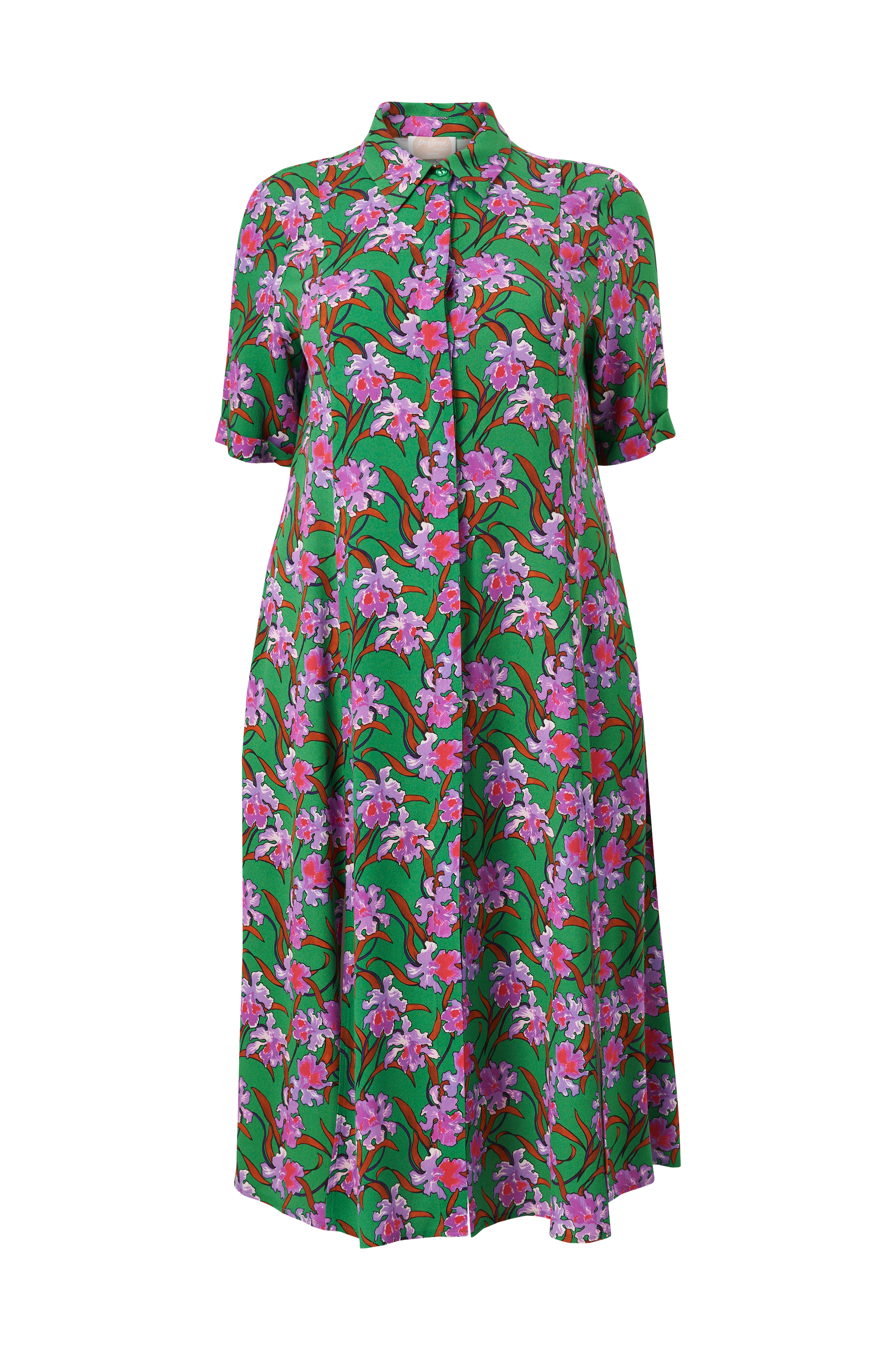 • Mønstret kjole i viskose• Model med svaj• Skjulte knapper foran• Korte ærmer med oprullet• Slidser foran• Lommer i siderne• Store størrelser• Længde: 120 cm i størrelse 46