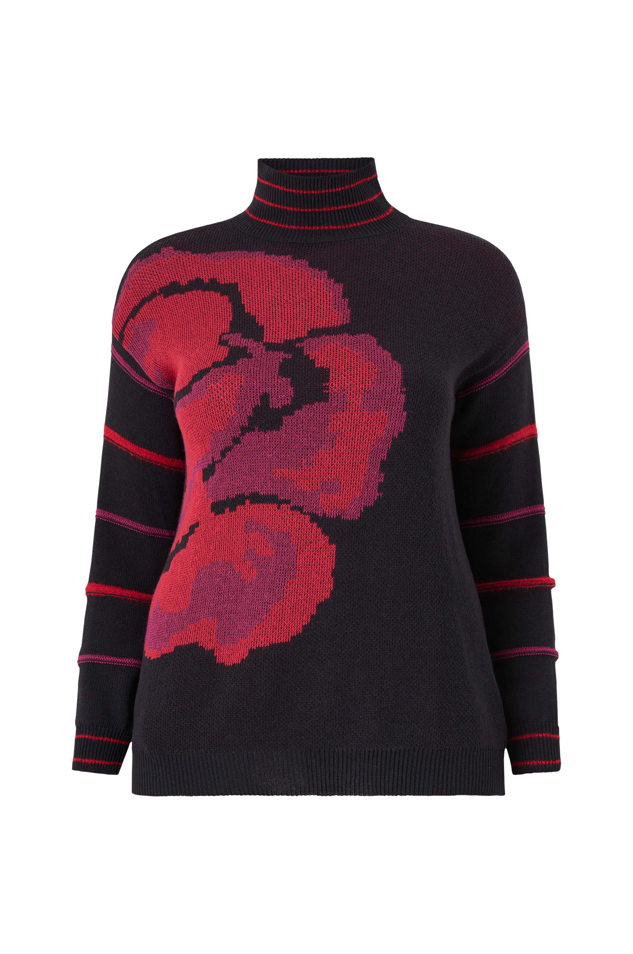 • Strikket trøje i uldblanding• Høj, ribbet halsudskæring• Ribbede kanter ved manchetterne og nederst• Store størrelser