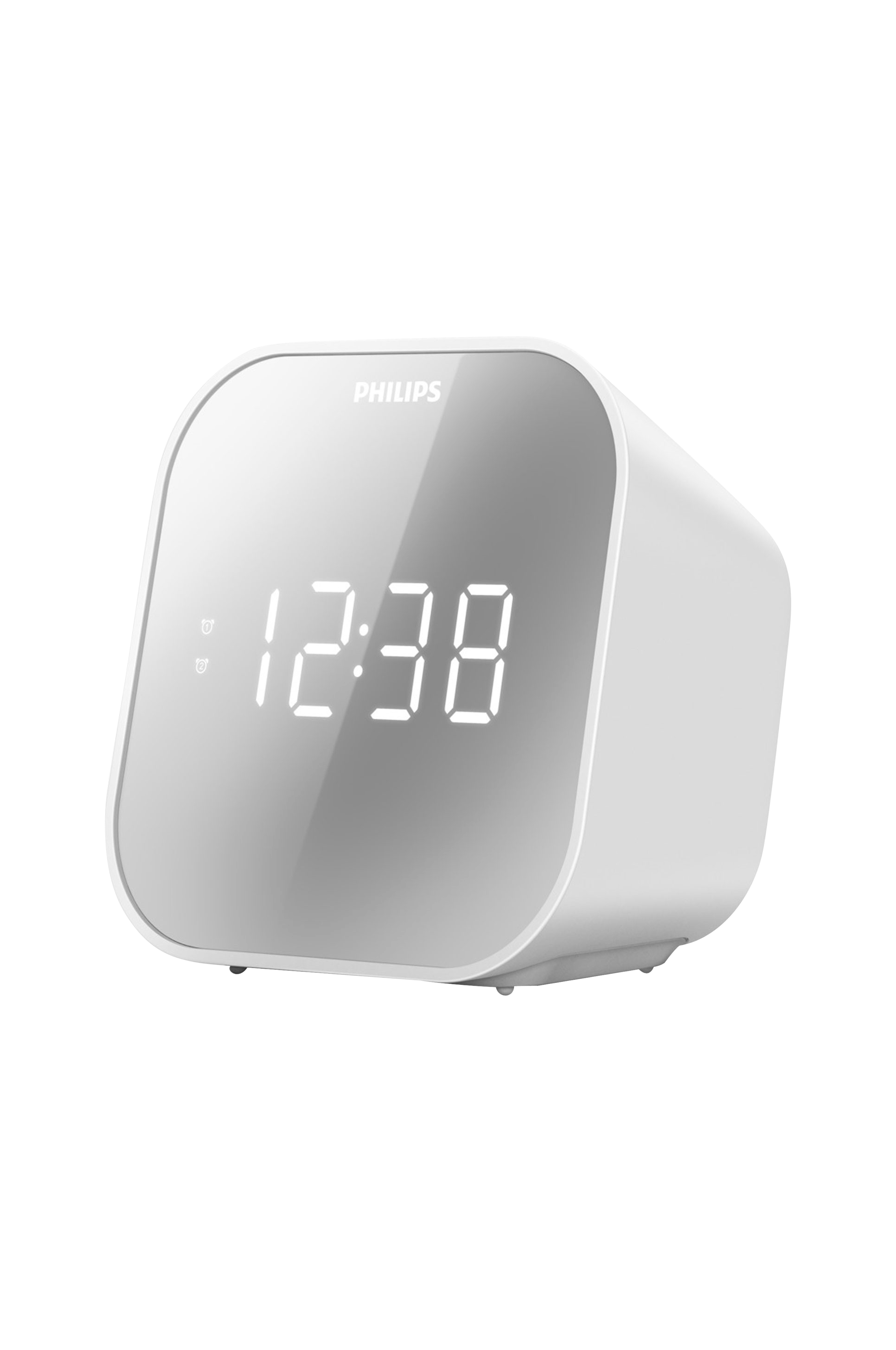 Denne FM-klockradio kan lade din mobil, mens du sover og vækker dig med et gradvis stigende alarmljud eller en radiostation. Den har en insomningstimer for at somne til radion. Kompakt og brugervenligt design.