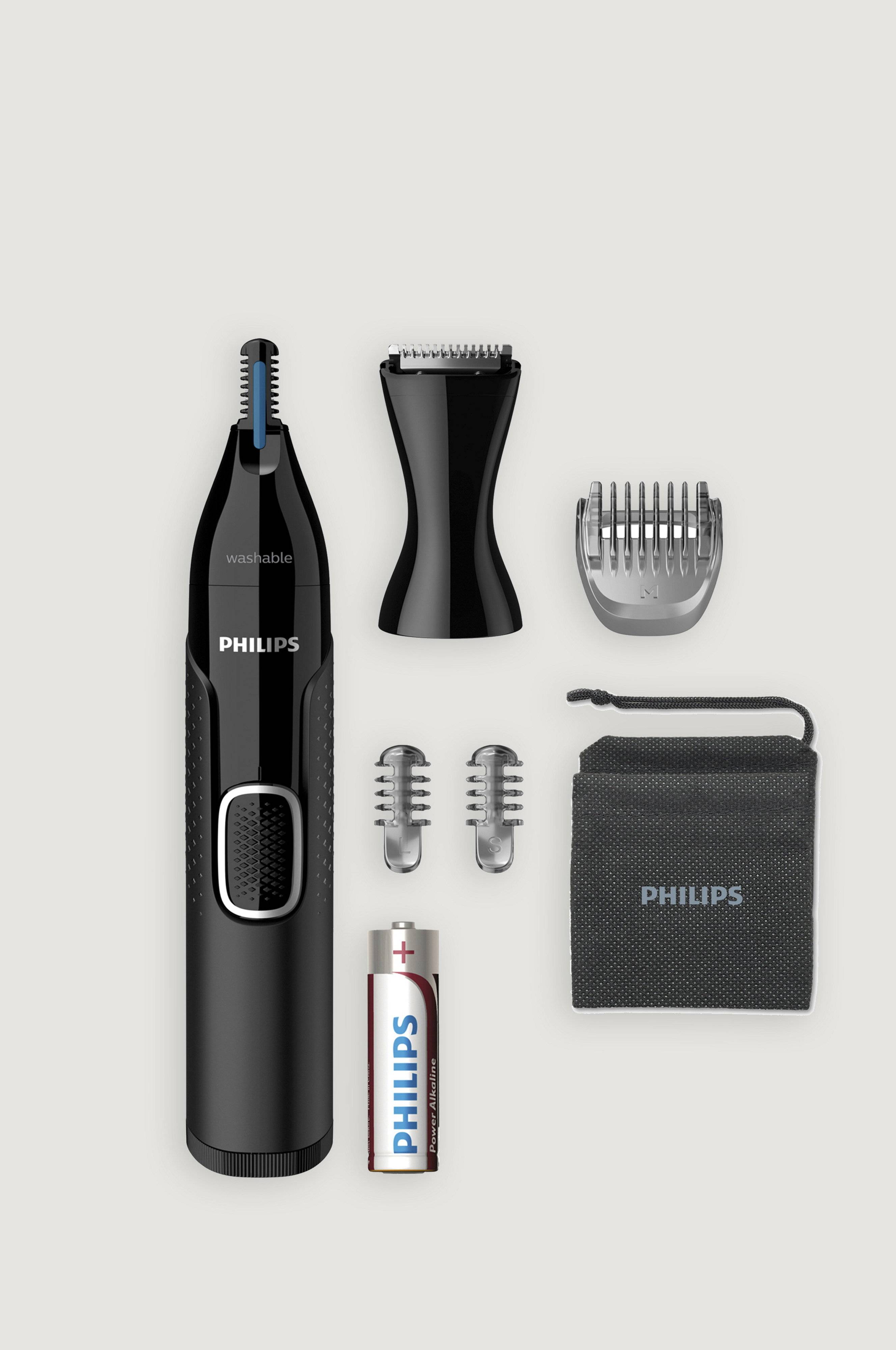 Philips næsetrimmer i serien 5000 trimmer skånsomt næsehår, ørehår, øjenbryn og detaljer. Den nye PrecisionTrim-teknologi og Protective Guard-systemet er designet til at sikre enkel og effektiv trimning uden at hive og trække.