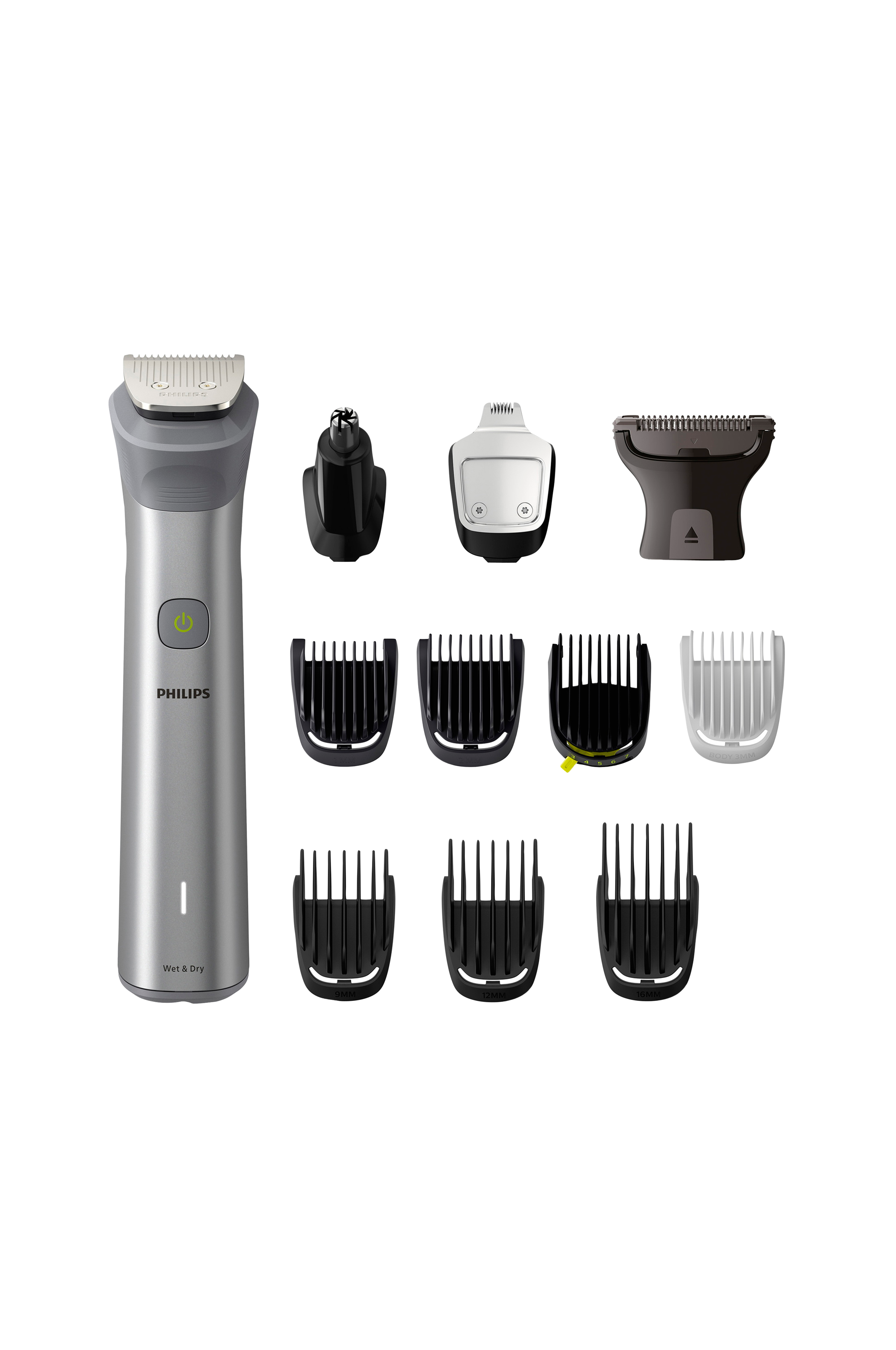 Skab dit personlige look med denne alsidige trimmer, der har 12 kvalitetsværktøjer til at style dit ansigt, hoved og krop. De selvslibende blade i rustfrit stål forbliver lige så skarpe som den første dag uden behov for olie, så du får en præcis trimning.
