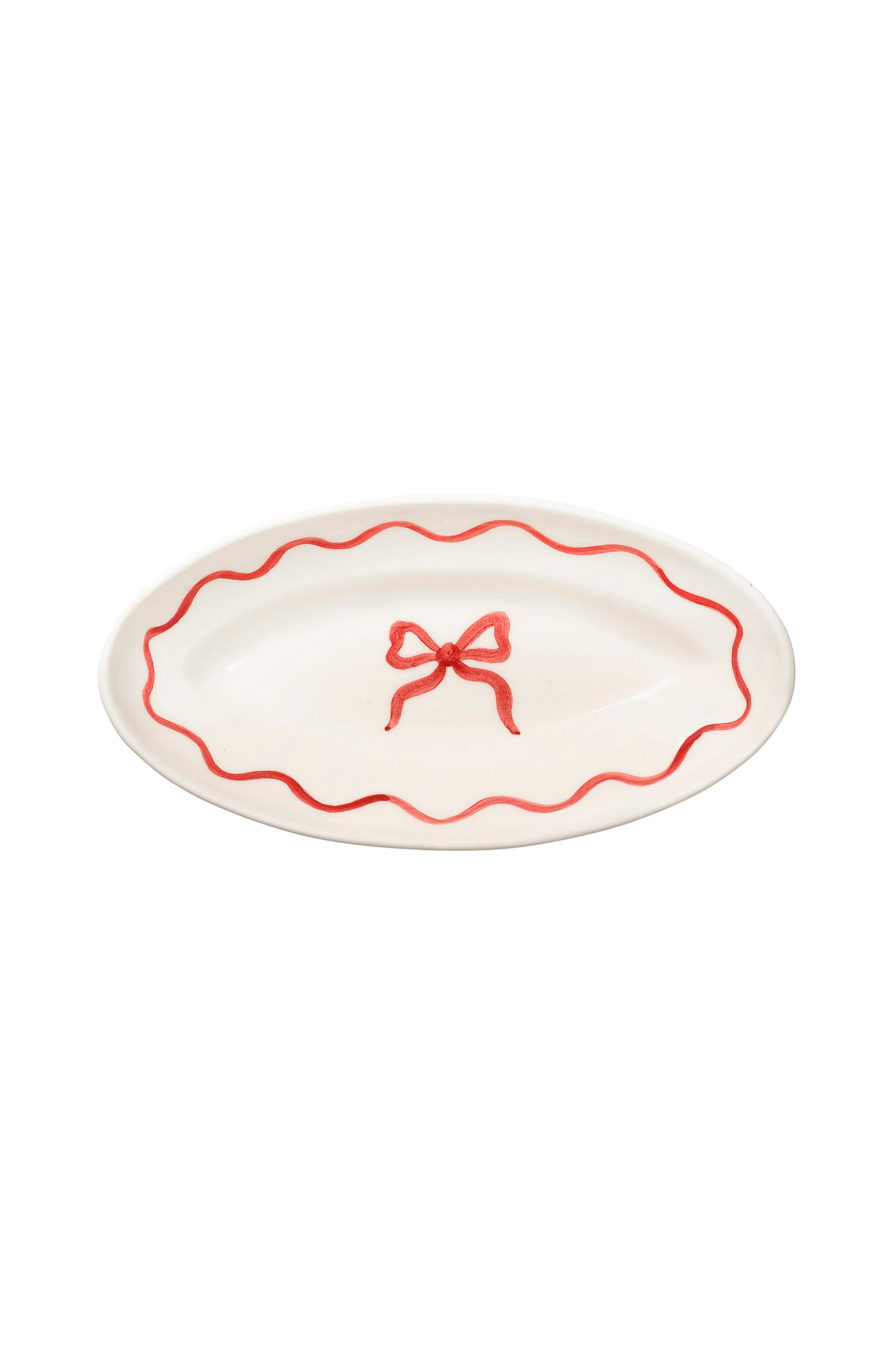 Vores Bow serveringstallerkener er omhyggeligt håndlavede i keramik ved hjælp af traditionelt håndværk fra Portugal. De giver en romantisk og tidløs fornemmelse til din borddækning. De har et klassisk hvidt udtryk med en varm kontrast af sort, hvor vores ikoniske Poppy bow er i centrum.
