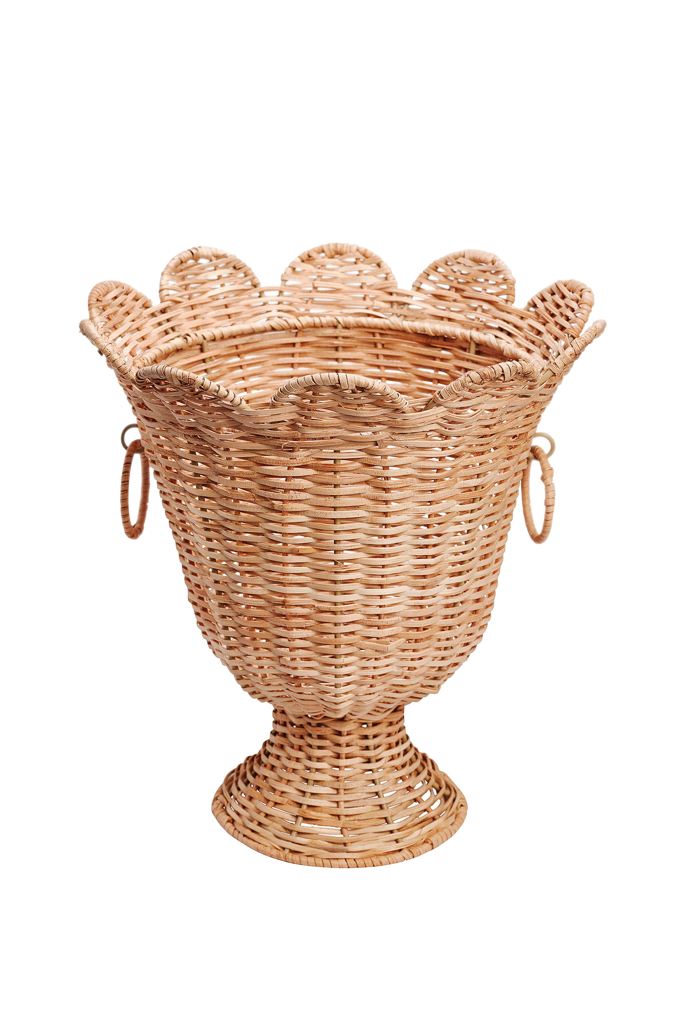 Bring naturlig elegance ind i dit hjem med vores Scallop Rattan Vase i Natural. Med sin organiske tekstur og skulpturelle skulpterede kant fungerer dette alsidige møbel smukt som en dekorativ vase, et stilfuldt potteskjulere eller bare som et statement i sig selv. Bemærk: Hvis du vil bruge den med friske blomster eller planter, skal du placere en vandtæt beholder indeni.