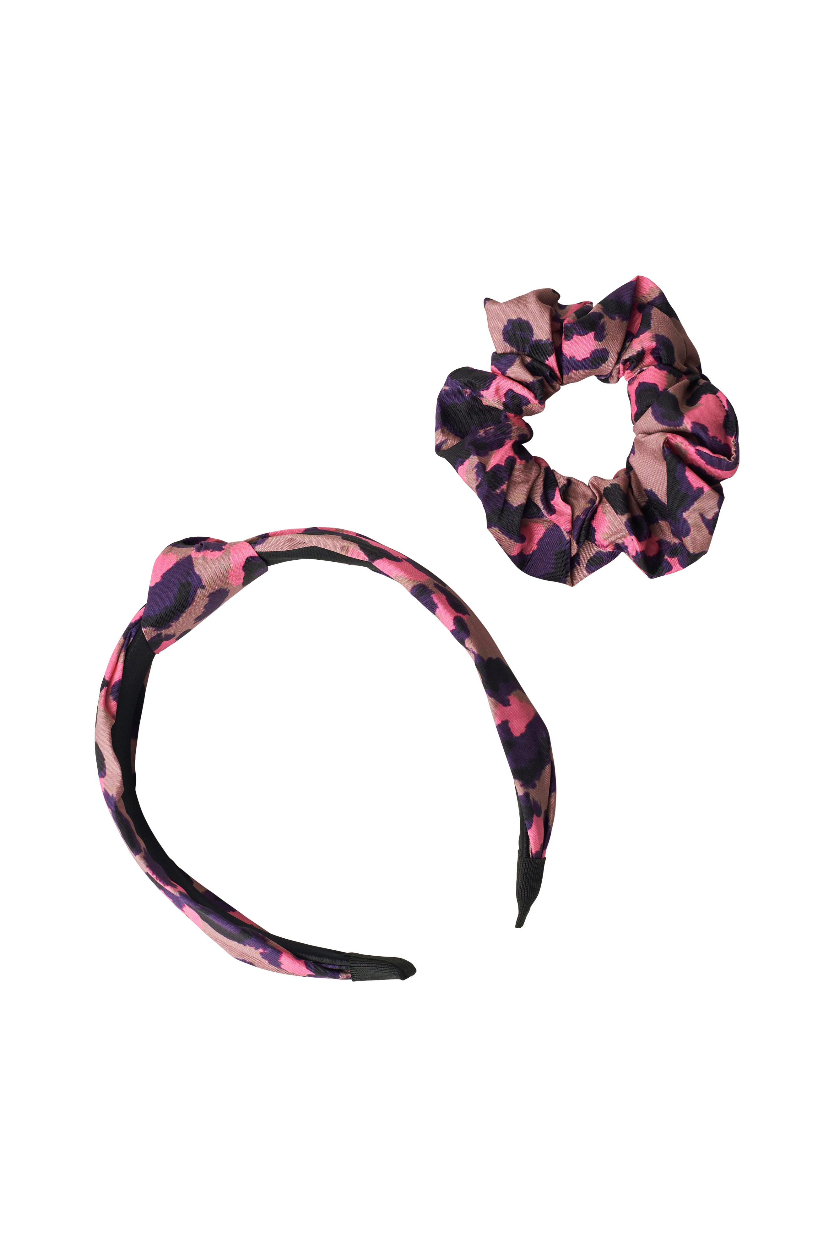 Matchende hårbøjle og scrunchie. Hårbøjlen har en dekorativ knude foroven.