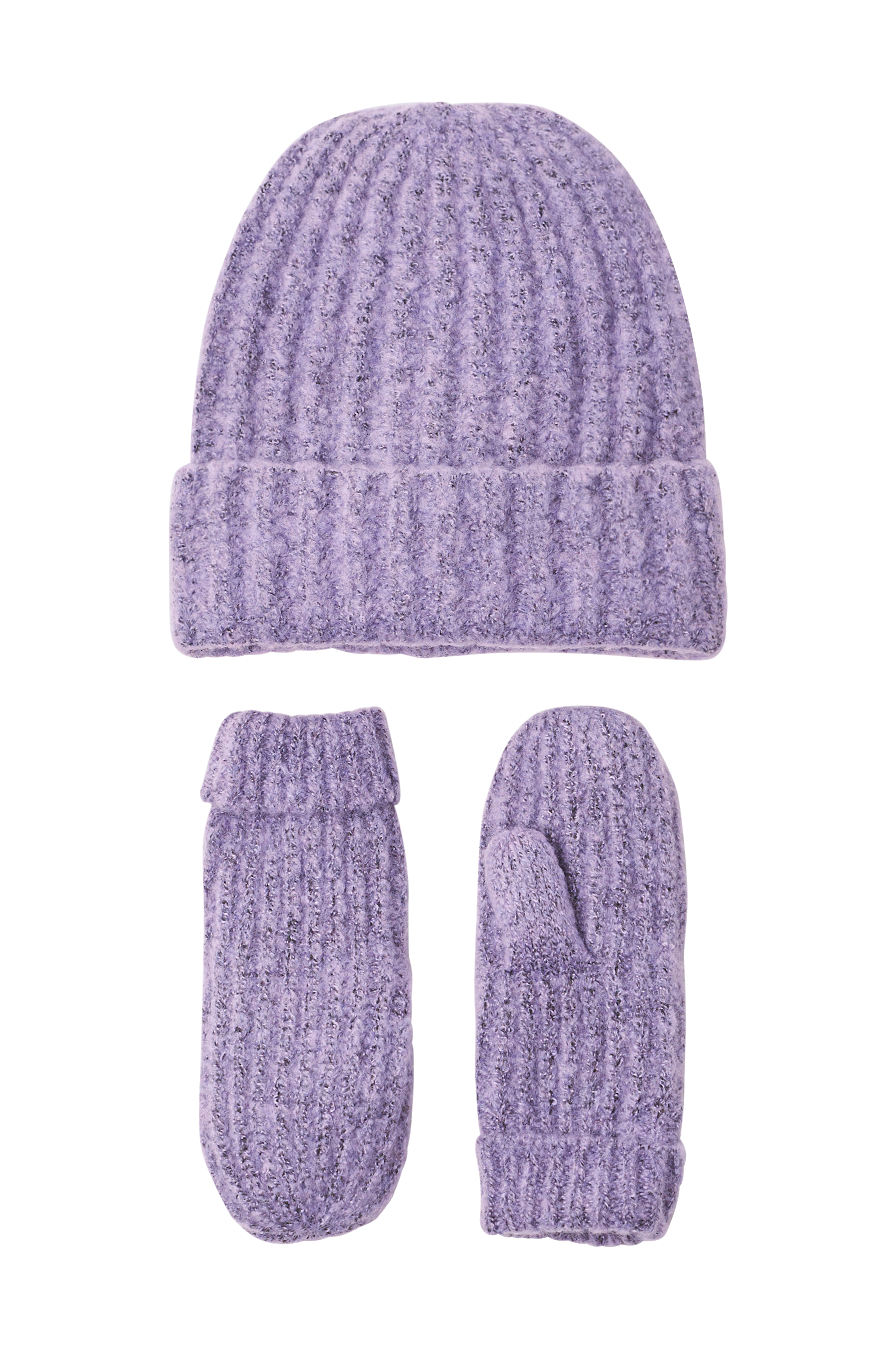 Strikket sæt i blød kvalitet med ribstruktur. Hue i beaniemodel med opslag i kanten forneden. Luffer med blødt, børstet for.