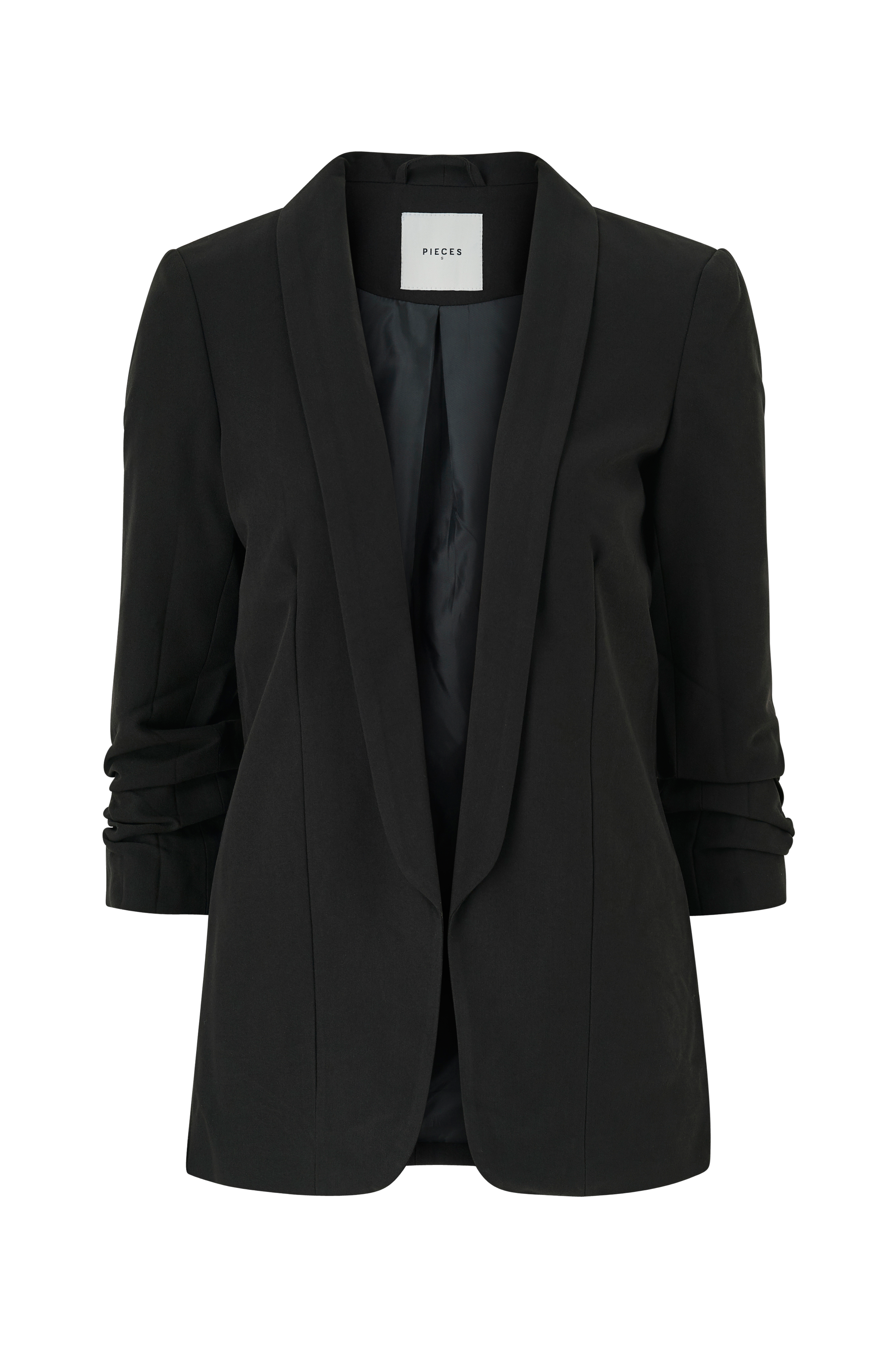 Blazer pcBoss 3/4 Blazer fra Pieces i åben model med sjalskrave og 3/4-lange ærmer med rynket underdel. Tynde skulderpuder giver flot pasform. I vævet kvalitet med let stretch og tyndt, vævet for.