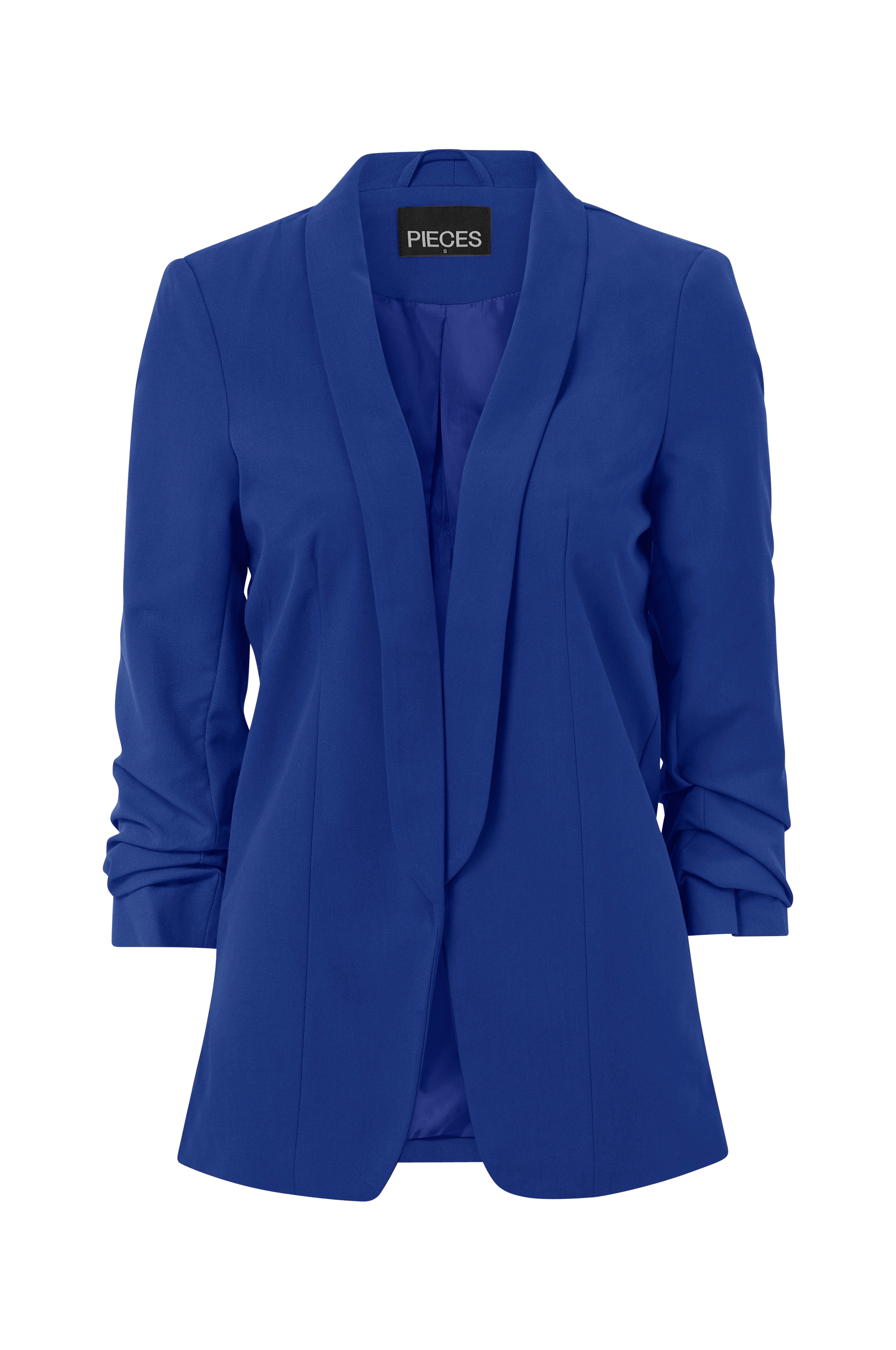 Blazer pcBoss 3/4 Blazer fra Pieces i åben model med sjalskrave og 3/4-lange ærmer med rynket underdel. Tynde skulderpuder giver flot pasform. I vævet kvalitet med let stretch og tyndt, vævet for.