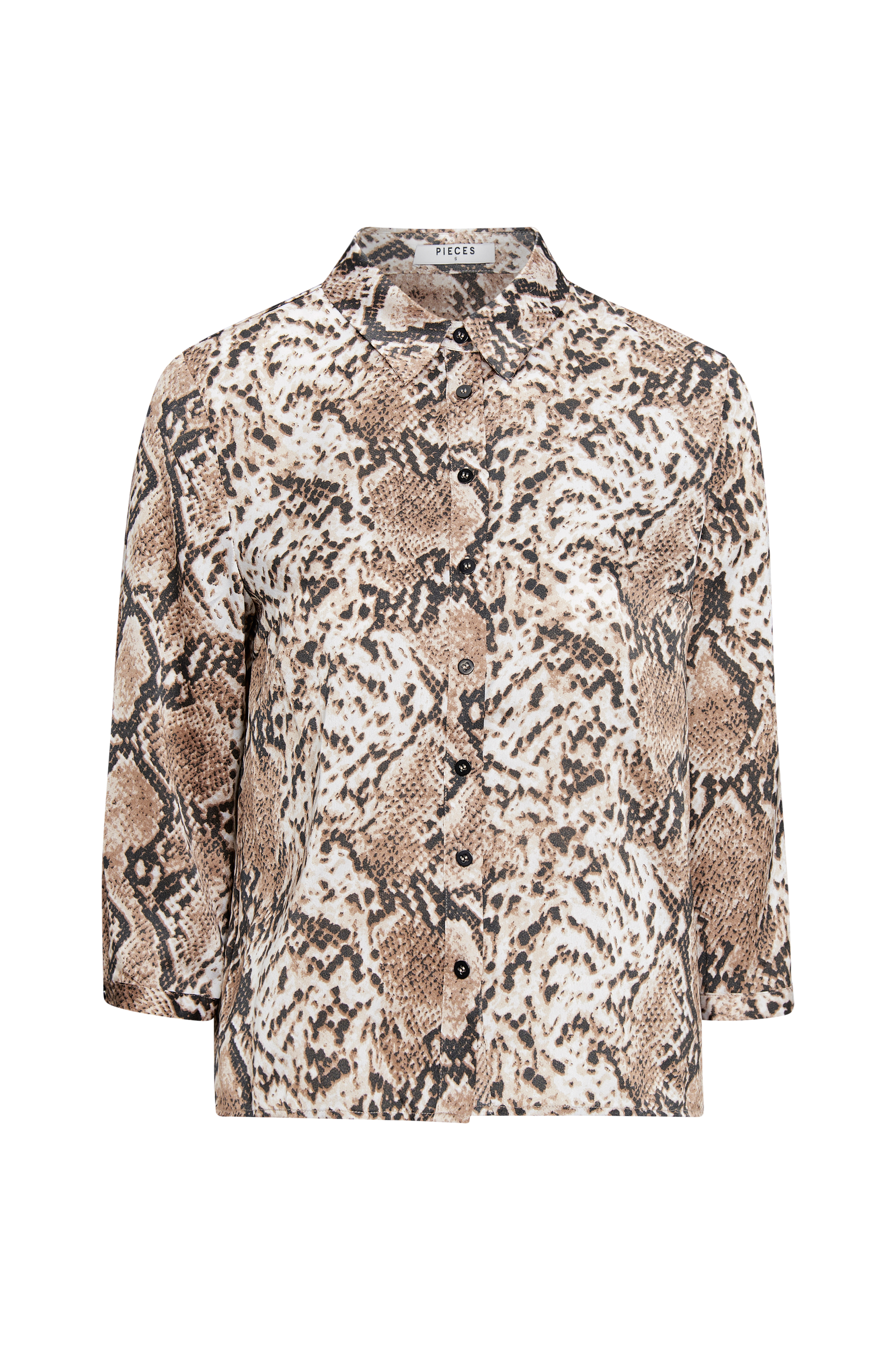 Bluse pcCelinen 3/4 New Shirt fra Pieces. Lige oversizemodel med lille krave og knapper hele vejen foran. 3/4-langt ærme med smal manchet i ærmekanten. Vævet satin med printet slangeskindsmønster.