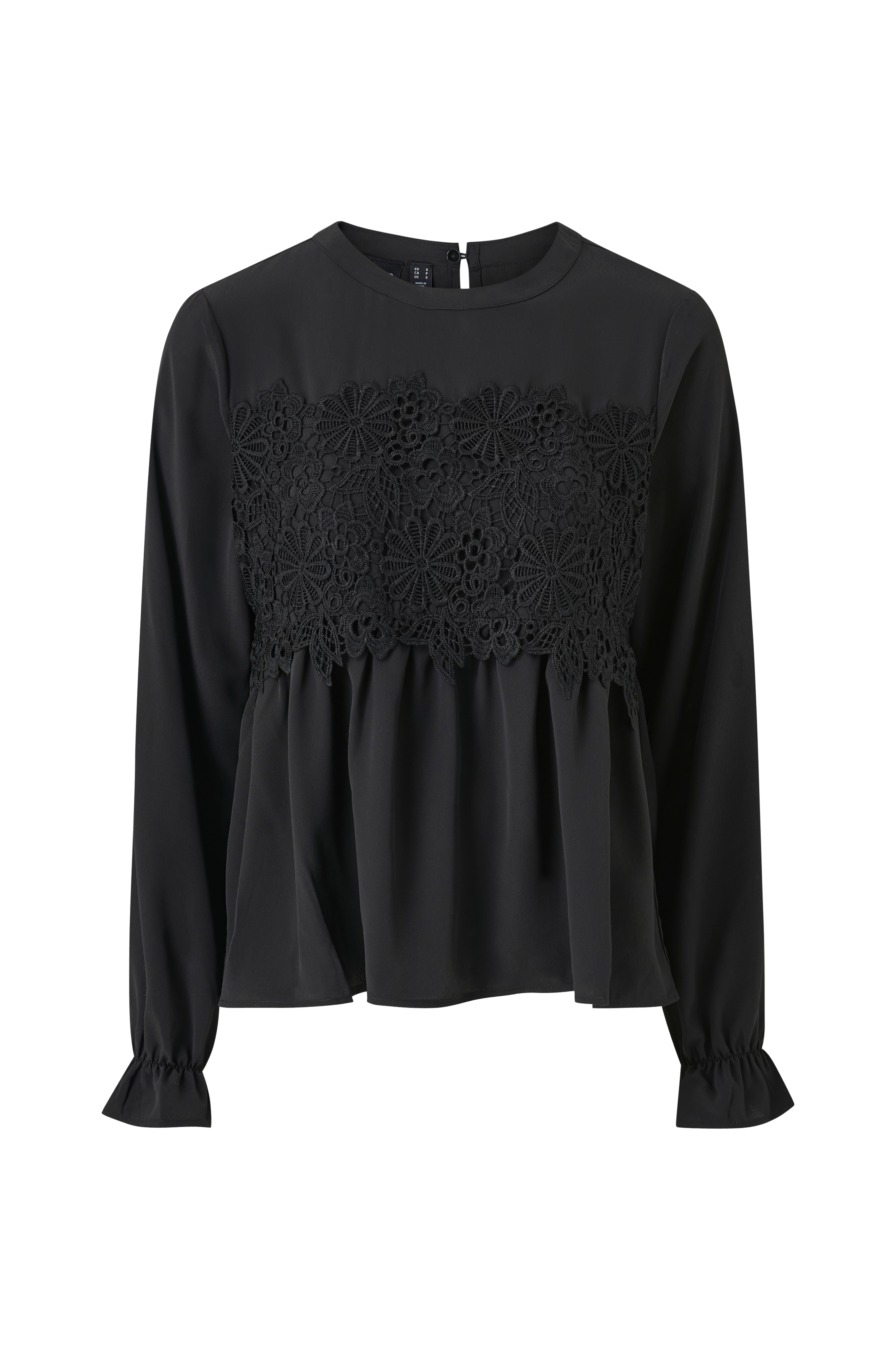 • Hæklet blonde foran• Ventilation med knap i nakken• Volant ved manchetterne• Rynket udskæring ved taljen