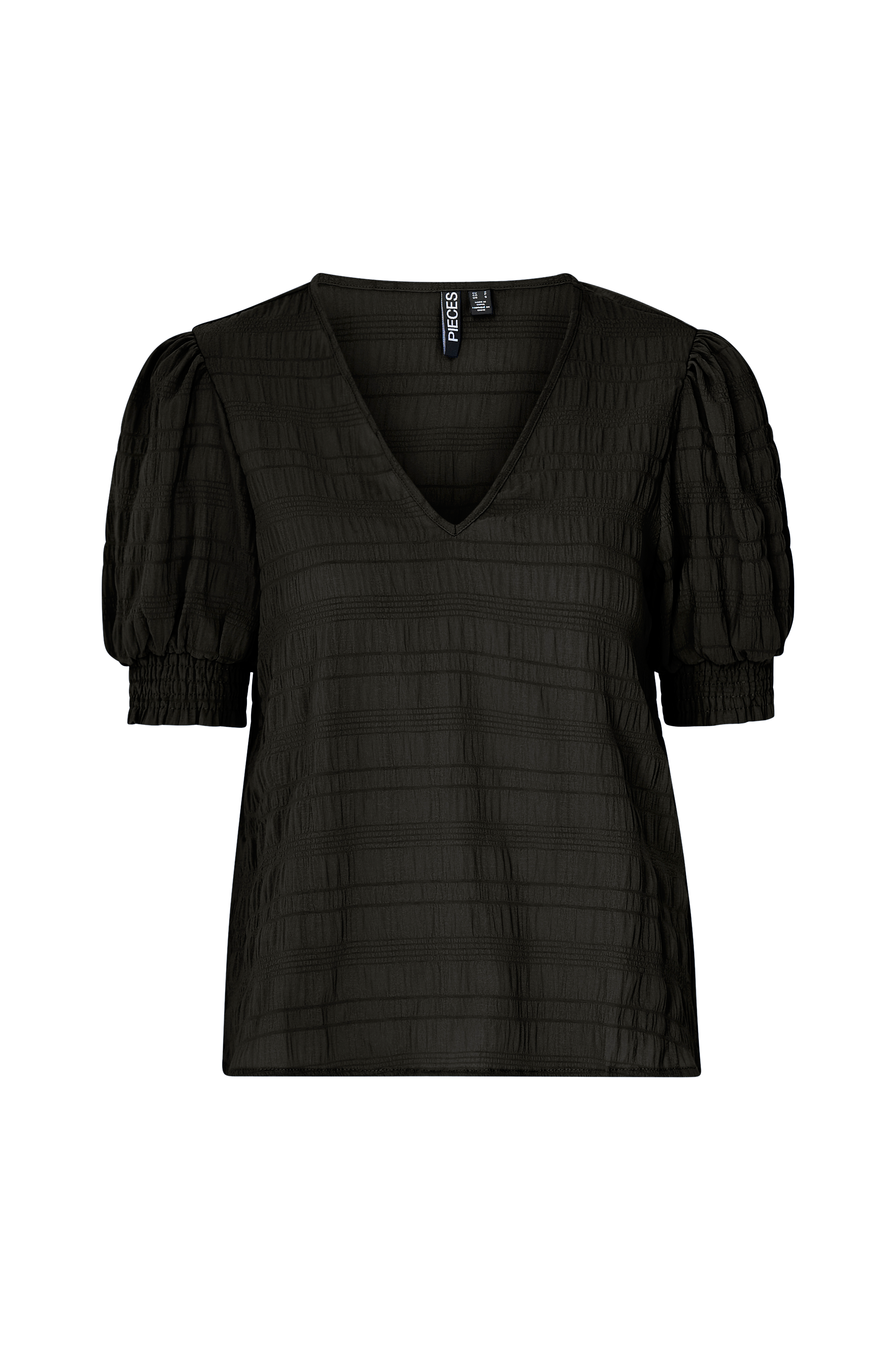 • V-udskæring• Korte ballonærmer med smock ved manchetterne• Vævet kvalitet med strukturmønster