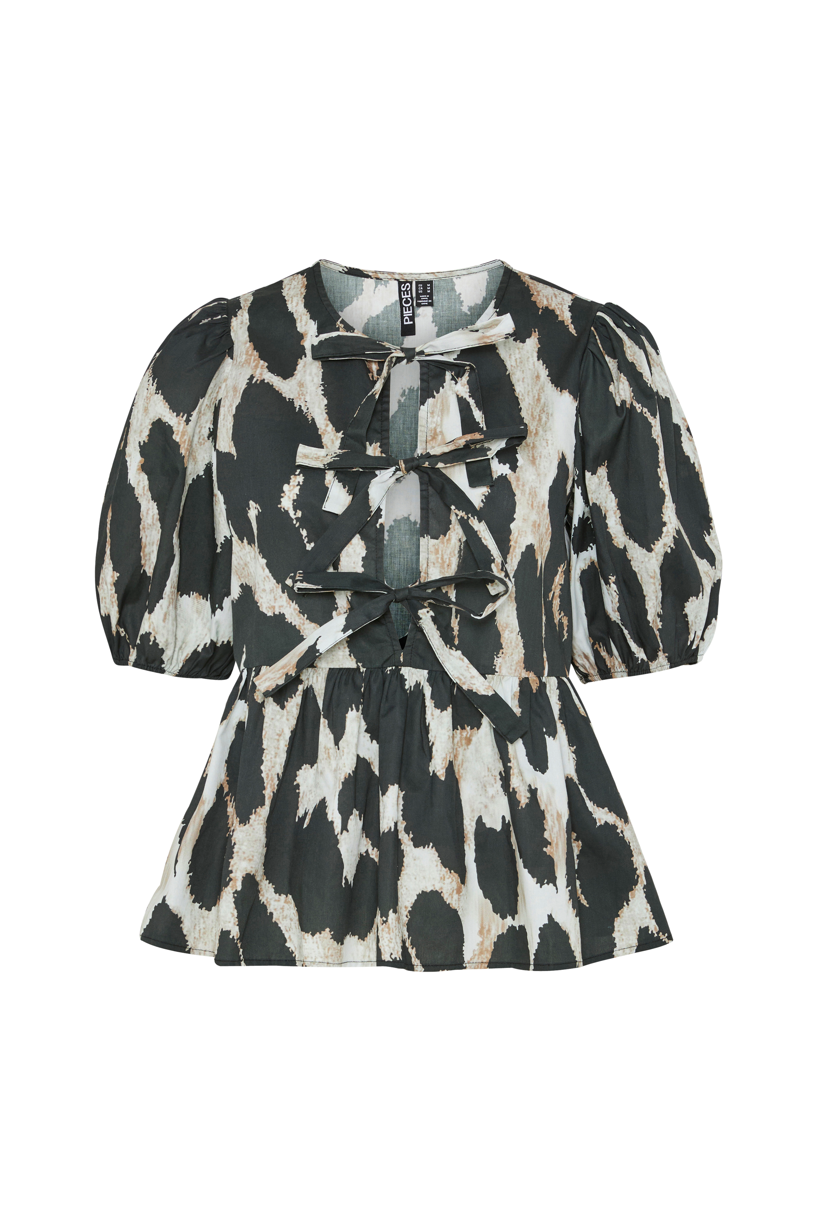 • Model med svaj• Rund hals• Knapstolpe med bindebånd foran• Kort ballonærme med elastik ved manchetterne• Peplumdesign med rynket talje