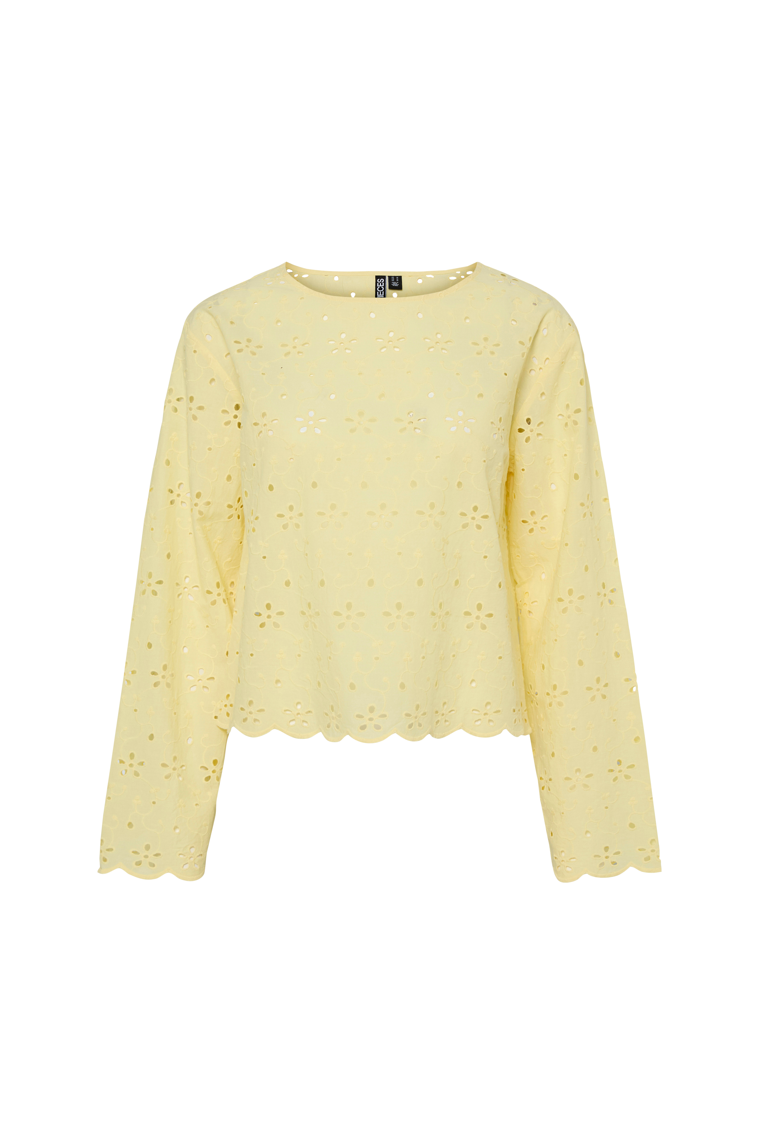 • Langærmet bluse i bomuld med hulbroderier• Rund halsudskæring• Bølgede kanter ved manchetterne og nederst