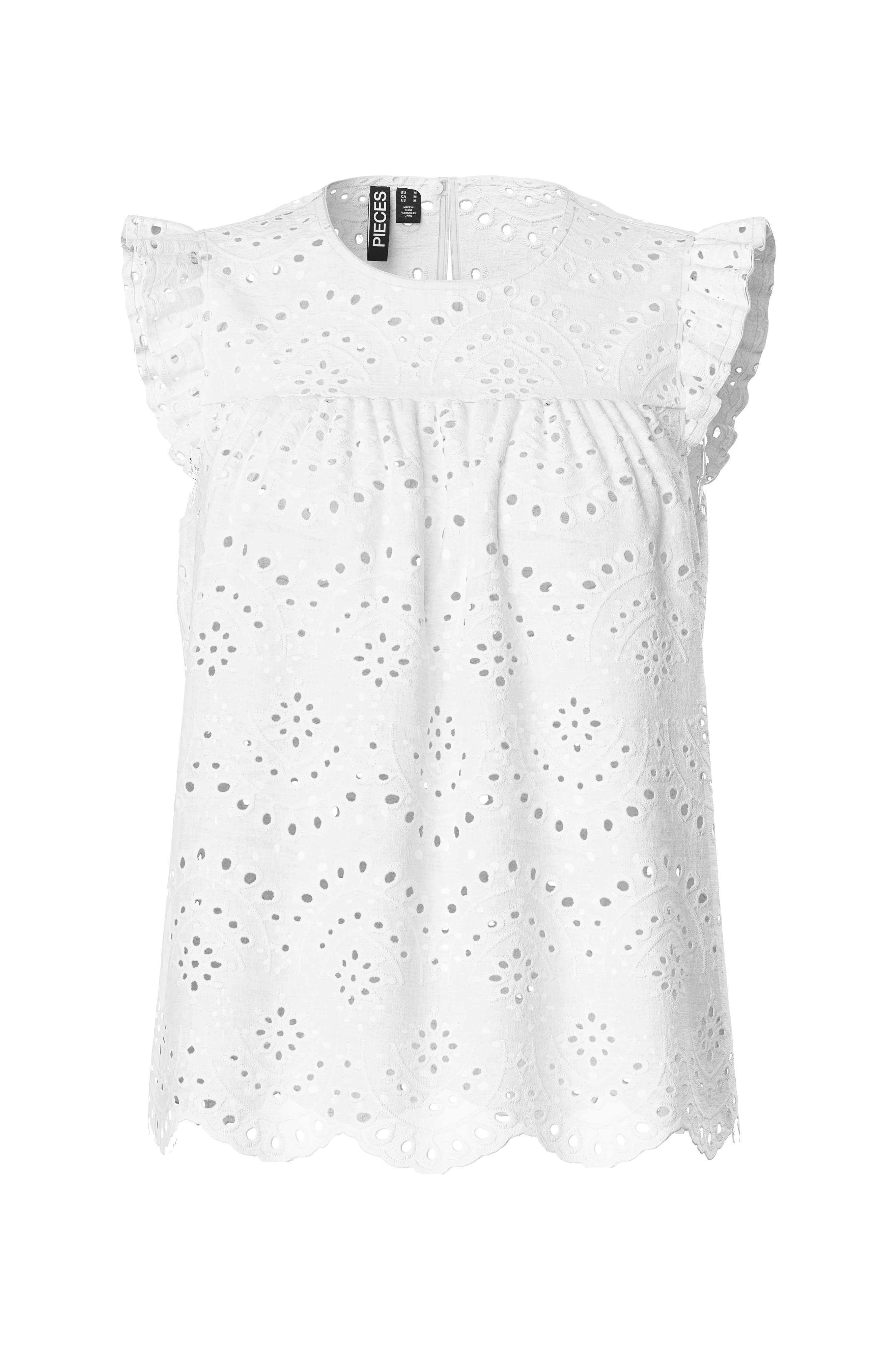 • Model med hulbroderier overalt• Rund hals med knap i nakken• Volant omkring ærmegabene• Rynket linning foran• Bølget søm