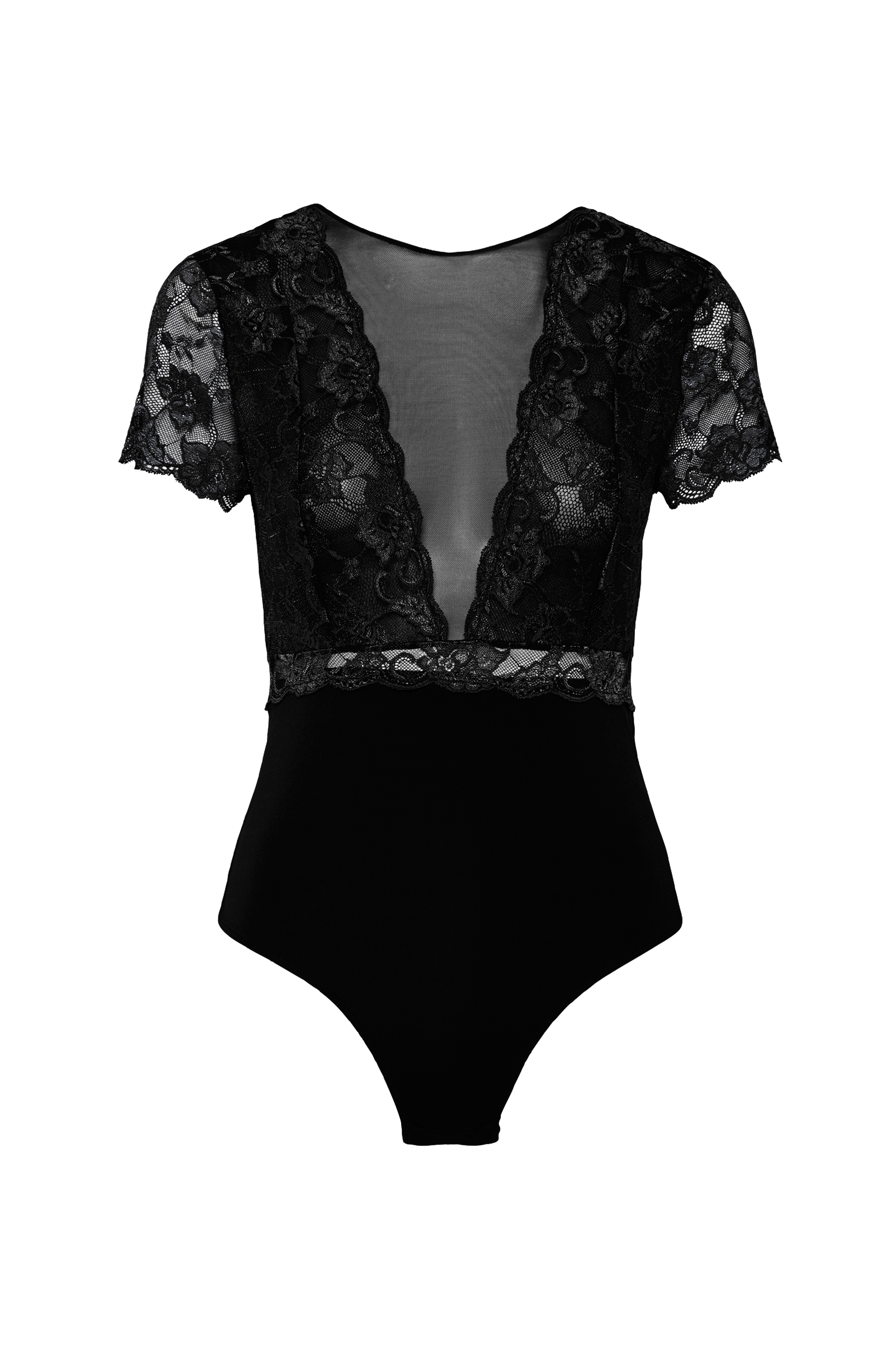 • Elastisk bodystocking med blonde og mesh på toppen• Foret skridt med trykknapper• Korte ærmer med blondevolant