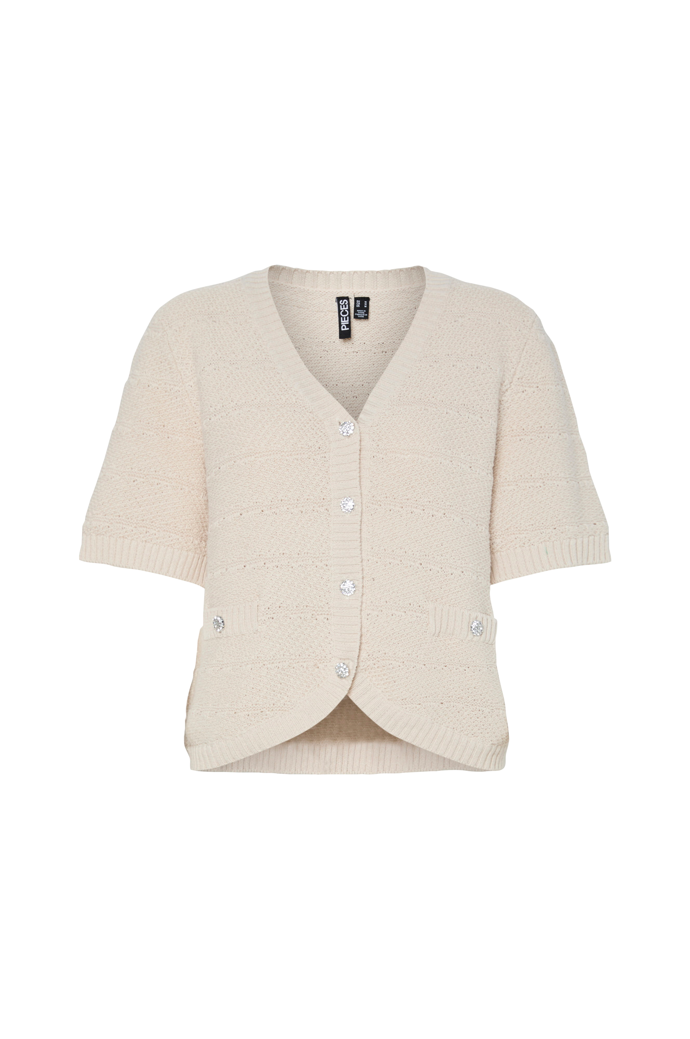 • Kortærmet cardigan med v-formet, ribstrikket halsudskæring• Ribstrik ved manchetterne og ved nederste kant• Dekorative, sølvagtige knapper med rhinstene foran• Snydelommer foran