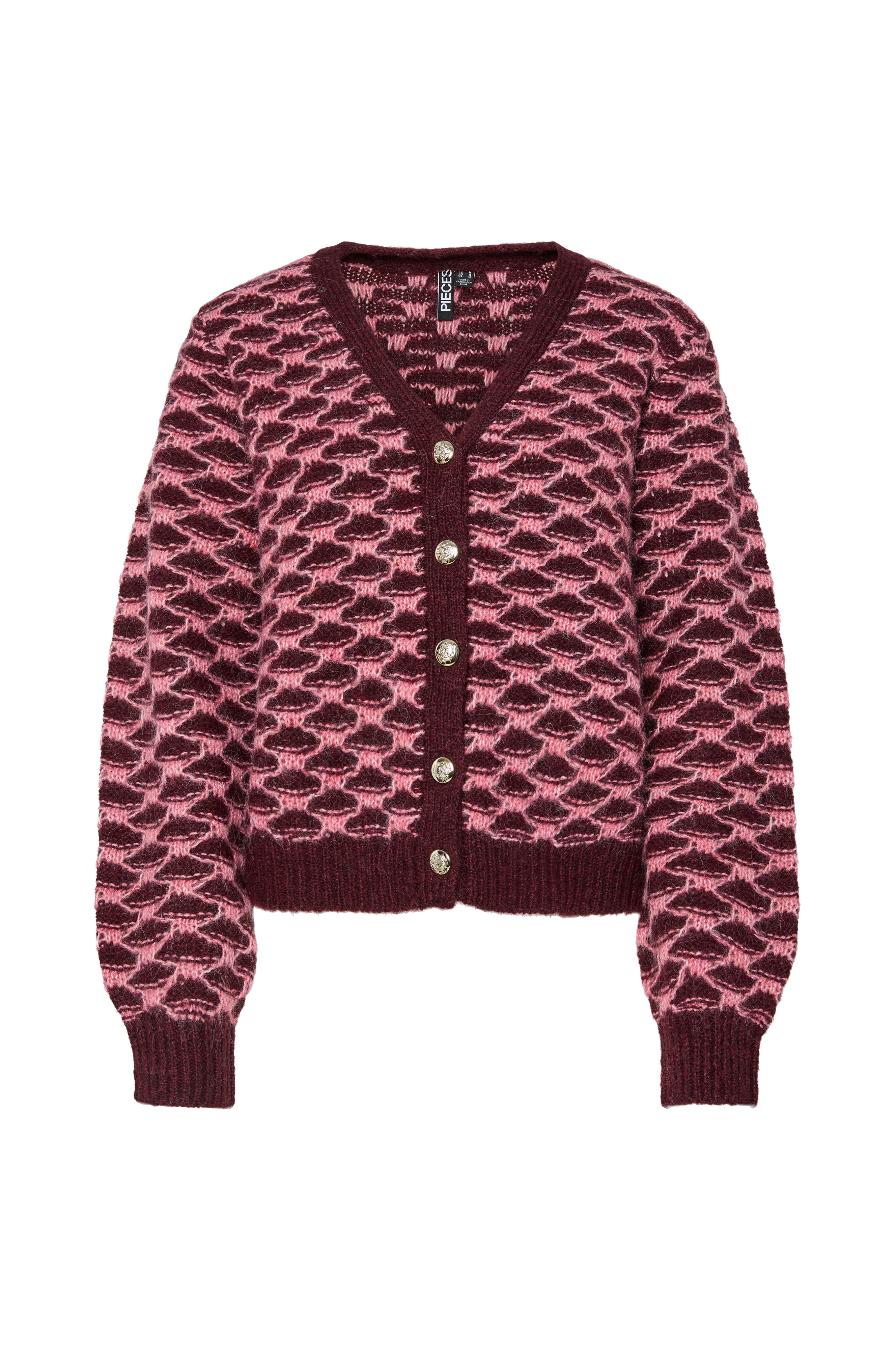 • Mønsterstrikket cardigan i uldmiks• V-formet halsudskæring• Dekorative, sølvfarvede metalknapper• Ribstrik ved manchetterne, nederst og rundt om halsen