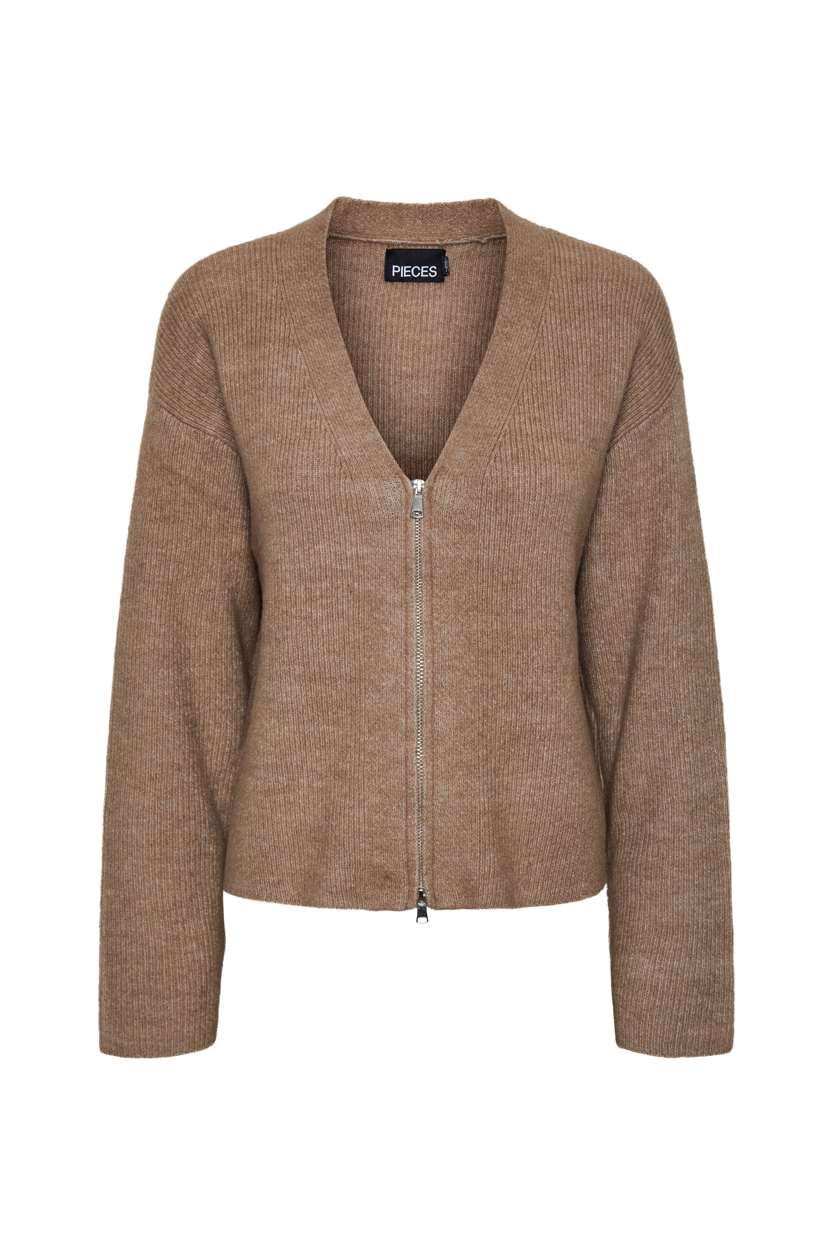 • Lige, ribstrikket model• V-udskæring• To-vejs lynlås• Nedsænket skulder med langt ærme