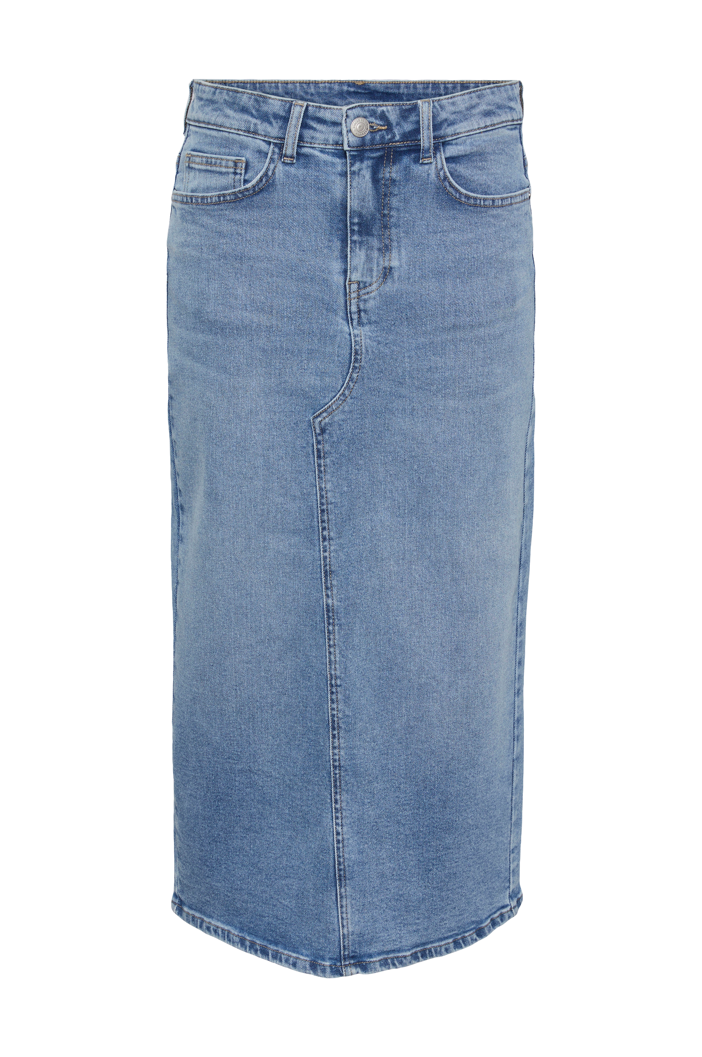 • Læglængde nederdel i strækdenim• Femlommemodel• Gylp med lynlås• Slids bagpå• Længde: 82 cm i størrelse S