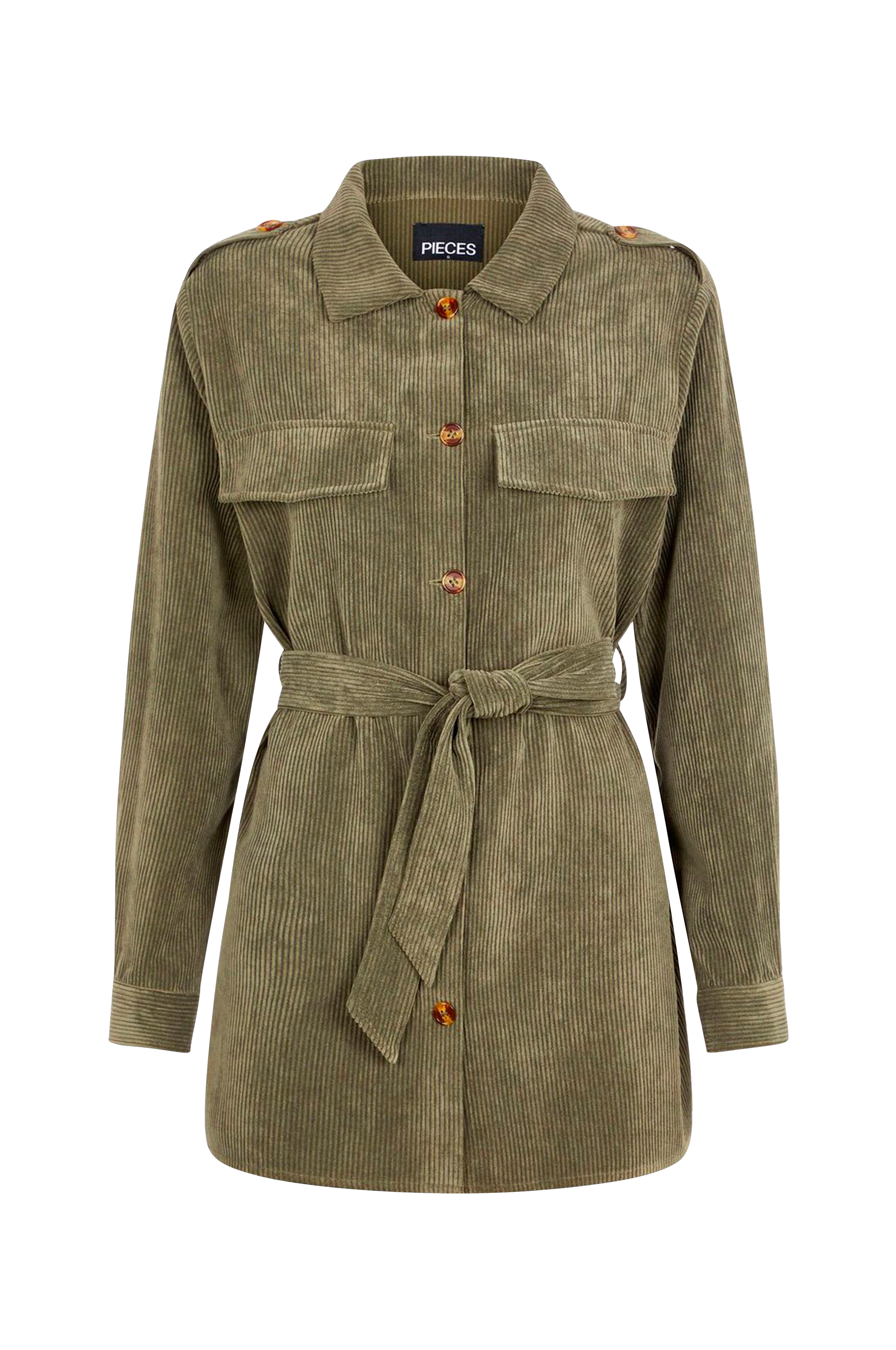 Fløjlsskjorte pcEffi LS Long Tie Shirt fra Pieces i noget længere model med knapper foran og bindebælte i taljen. Pynteklap på brystet. Lange ærmer med manchet og knap i ærmekant og tamp på skuldrene.